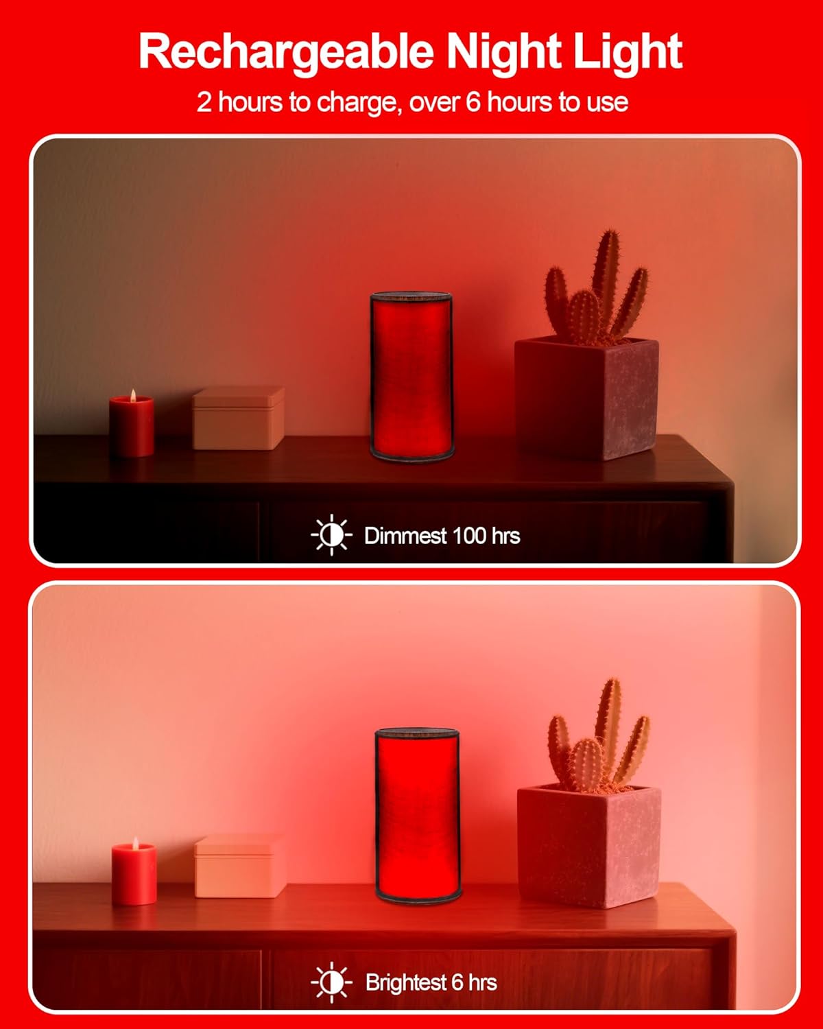 Dual Light Modes + Smooth Dimming: Instantly switch between medical-grade 630nm red ((for sleep onset) and 1500K amber (for midnight navigation). Long-press to adjust brightness from 1%-100%—no jarring fixed levels, exclusively tailored for sleep-sensitive needs
