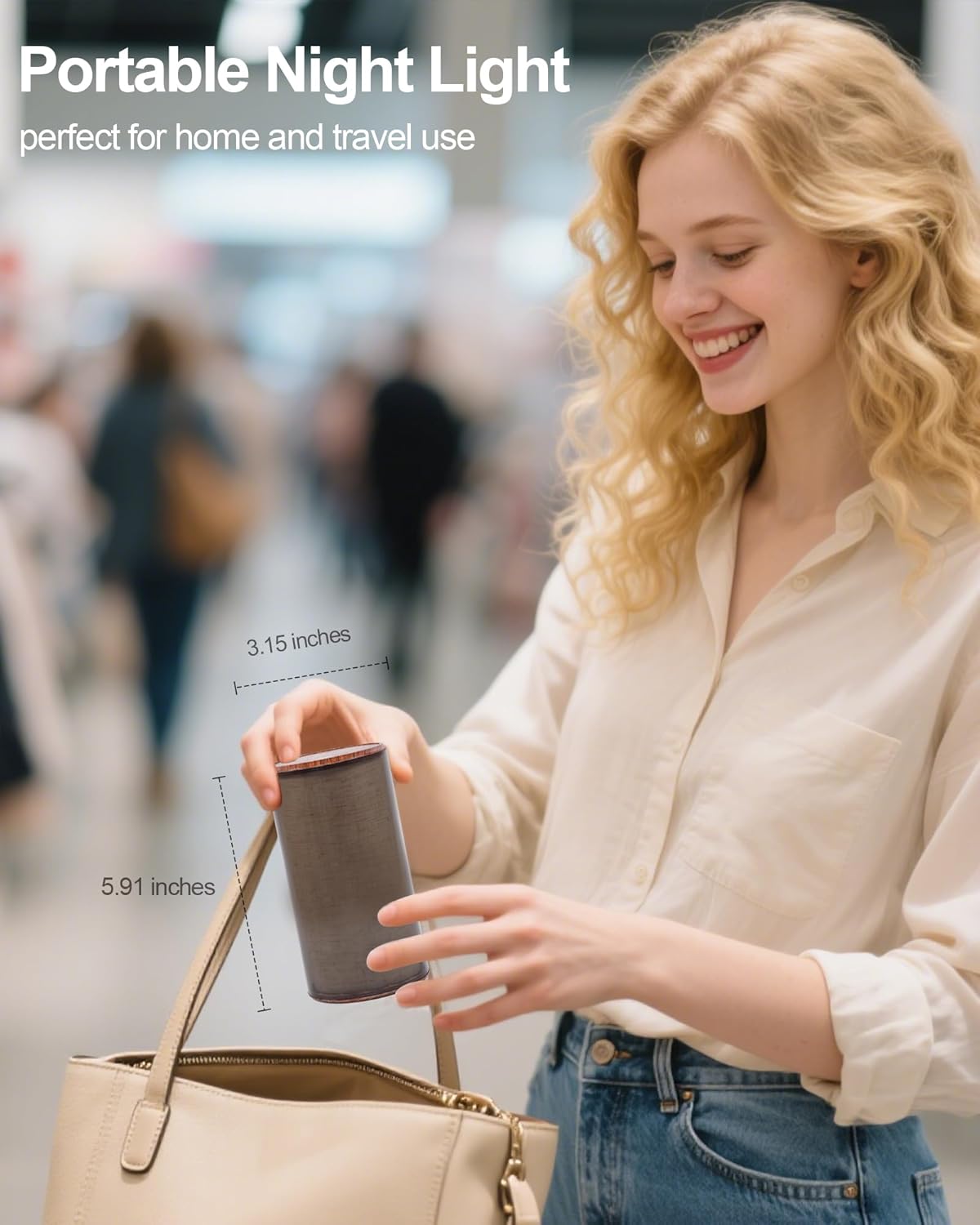 Premium Natural Material Design: Linen-diffused glow inside a cylindrical ABS body with dark walnut wood accents. IP20-rated safe for bedrooms. Compact size (Φ3.15″x5.91″) fits nightstands or travels