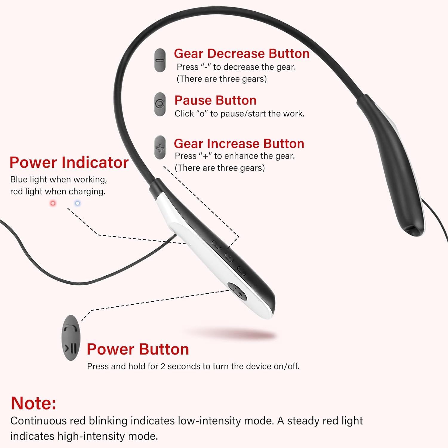 3 Intensity Modes: Default Setting (Power On) – Red light therapy for ears starts in Mode 2 (Medium Intensity), indicated by a rapid pulsing light. Increase Intensity – Press the “+” button to switch to Mode 3 (High Intensity), shown by a steady, continuous light. Decrease Intensity – Press the “- button” to switch to Mode 1 (Low Intensity), indicated by a slow pulsing light(Note: The device’s power indicator light glows blue during operation.).