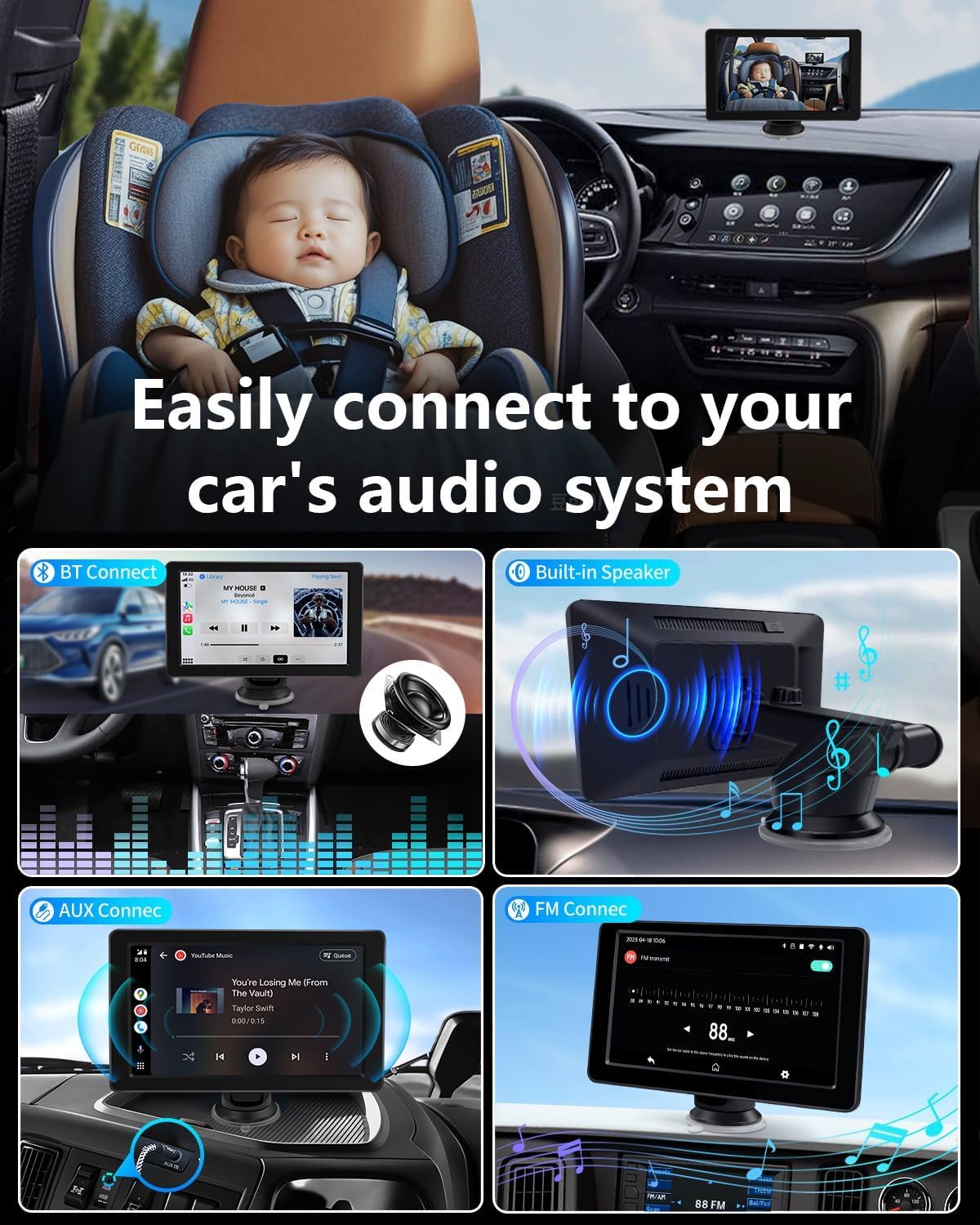 Infotainment System: This car camera for baby supports CarPlay and Android Auto, allowing you not only to keep a close eye on your little one, but also to effortlessly access essential features like maps, phone calls, messages, and music while on the go. With voice assistant technology, you can enjoy hands-free control, significantly enhancing both driving efficiency and safety.