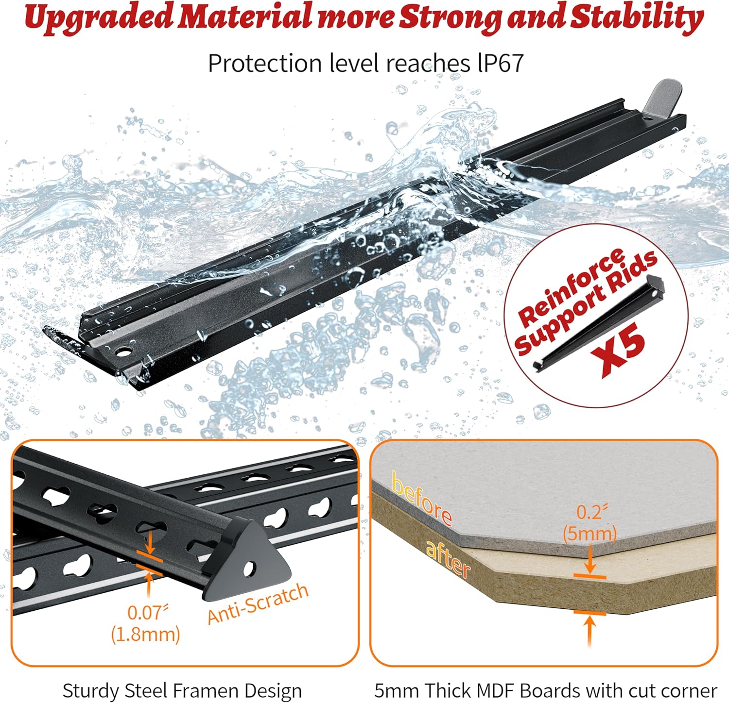 【2200LBS Garage Storage Shelves with 5 Reinforcing Support Ribs】Constructed with 5mm high-density fiberboard and a rolled-edge, thickened metal column frame, each shelf features additional reinforcing support ribs at the base for robust support. Each shelving holds up to 440 lbs, with a total weight capacity of 2200 lbs. Industrial-grade stability and durability make it ideal for commercial use in factories and businesses.