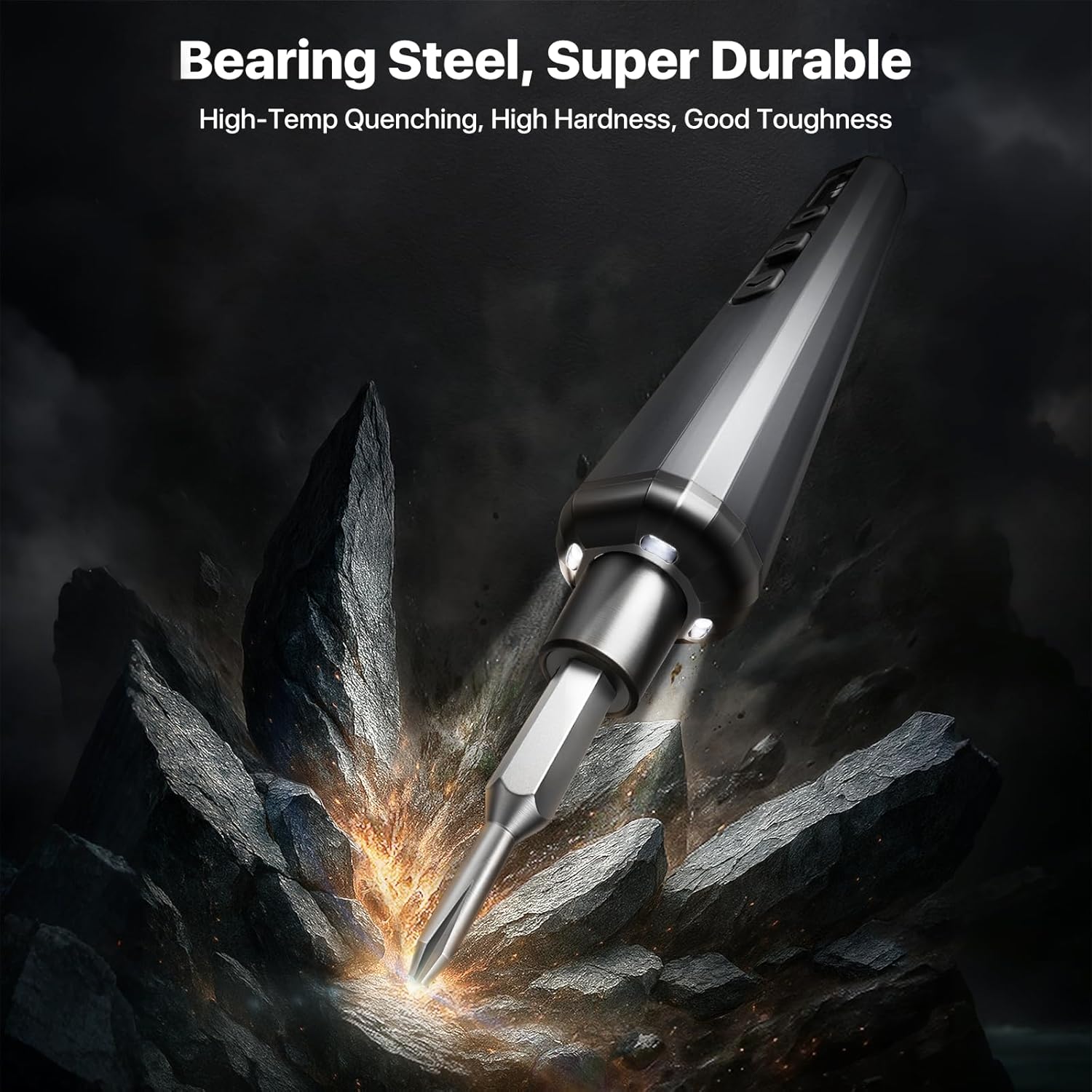 [S2 Steel Bits, Super Durable] All precision bits are made of the best S2 Steel and the hardness can reach over HRC70°, resist abrasion, oxidation and corrosion, ensure long time use. In addition, the strong magnetize-able tip easily pick-up and hold screws, helping you handle all tiny screws. The LED light on the head accurately illuminates the working area, allowing you to see clearly and accurately tighten screws even in dark places, further improving operational accuracy and efficiency.