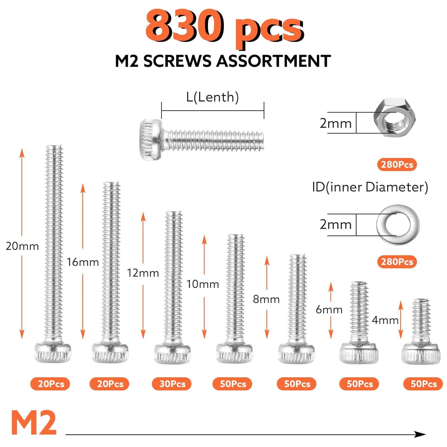 1.M2 screw and nut set come with reinforced flat washers, available in 7 sizes, 830 pieces in total, as well as a custom M2 hex wrench and 1 tweezers for easy access, installation and removal.