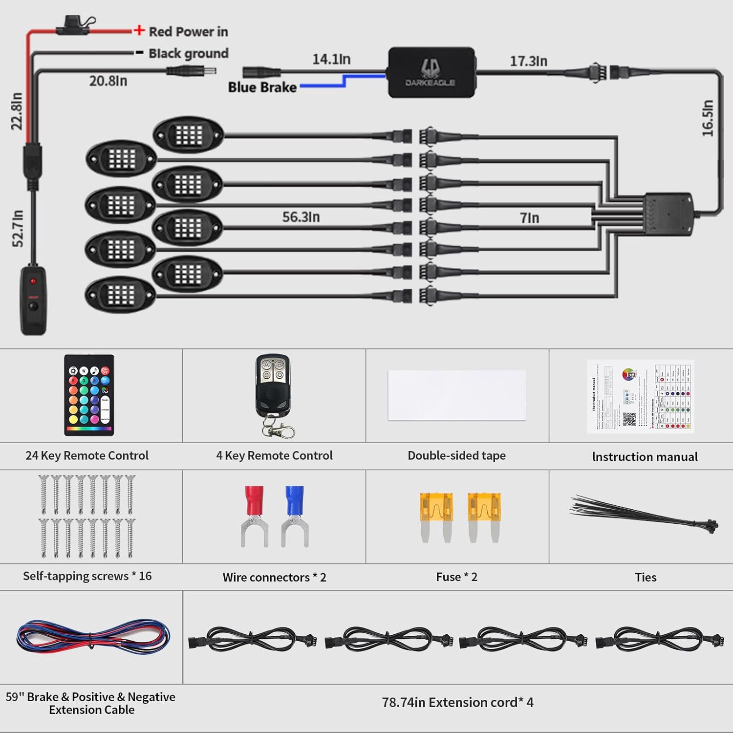 Easy Installation and Additional Wiring: The Under glow light kit for truck package includes all the accessories needed for installing LED rock lights, including 4 pieces of 78.74-inch extension wires, allowing you to place rgb rock lights on your truck at a greater distance to accommodate various vehicles. It also comes with self-tapping screws, zip ties, heat shrink wire connectors, fuses, and more, making it ideal for installation in Trucks, Jeeps, cars, SUVs, off-road vehicles, ATVs, UTVs, RZRs, golf carts, and other vehicle models with 12v DC power sources