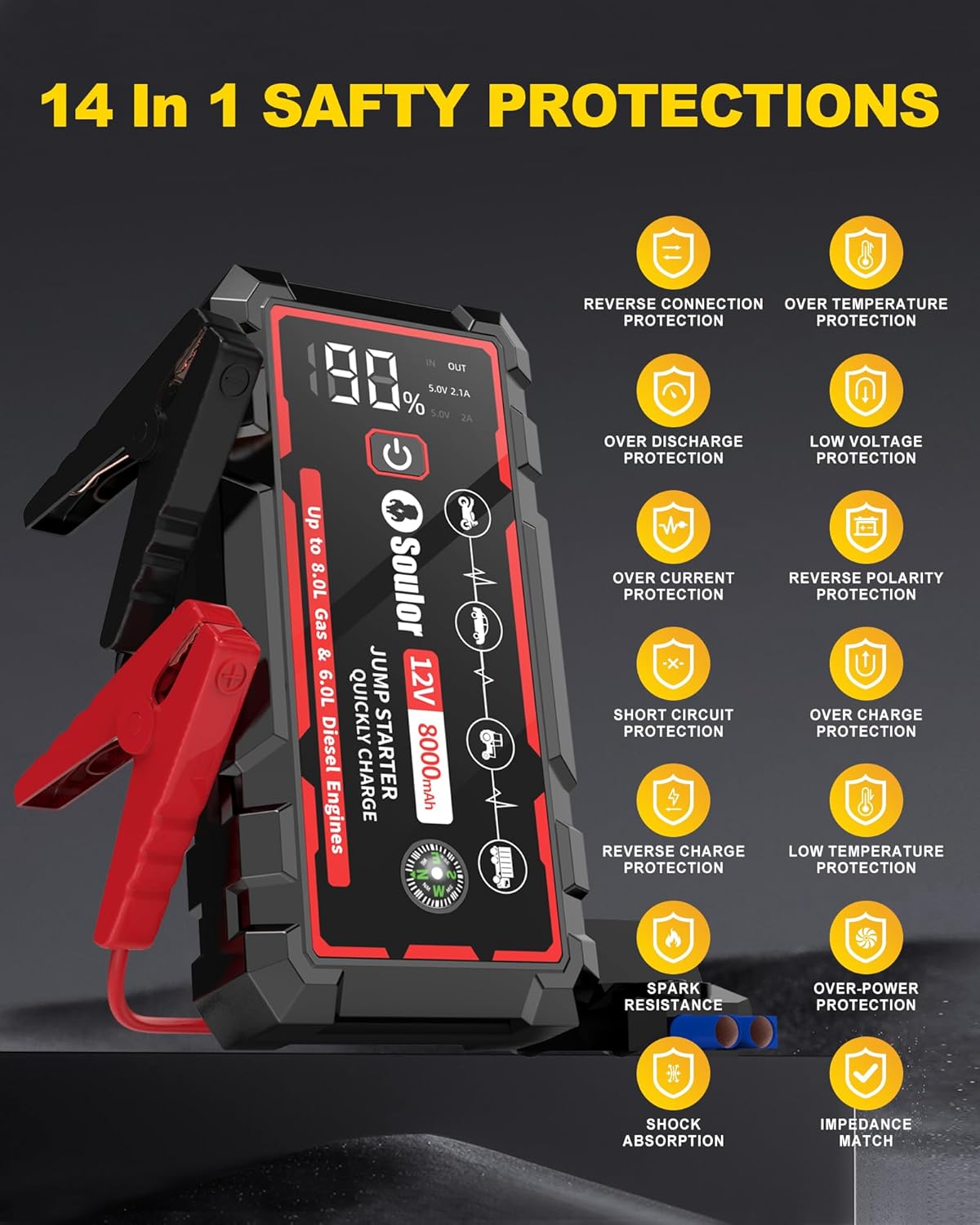Start Dead Batteries: It can jump-start 12 V vehicles up to 50 times on a single charge and operates reliably in extreme temperatures from -4°F to 140°F, ensuring its performance is maintained when you need it most. The built-in Forced Start function ensures a successful ignition when the car battery is severely depleted. Stay prepared for any roadside emergency. Works on motorcycles, cars, trucks, pickups, tractors, RVs, etc