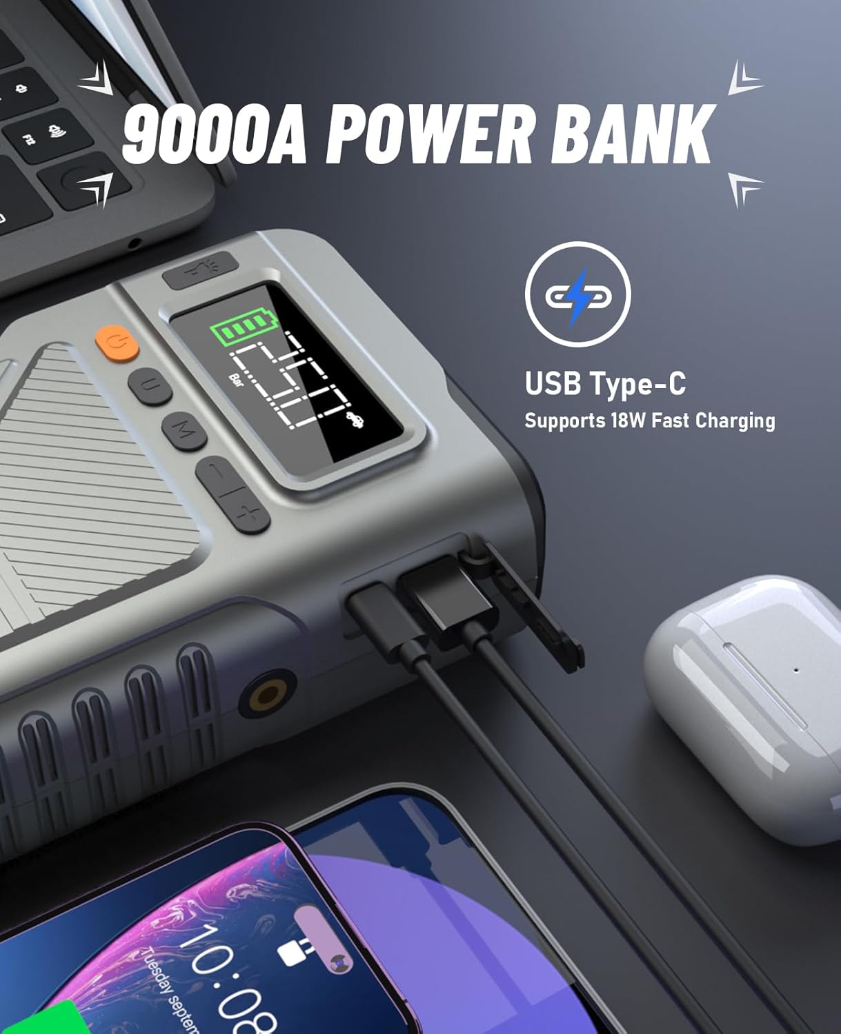 MULTI-FUNCTIONAL USE: In addition to emergency starting and tire inflation, the portable car charger is also a power bank that supports 18W fast charging, with 3 mode LED light. This versatile car jump starter with air compressor tool adds extra functionality to the jumpstarter for all-around convenience