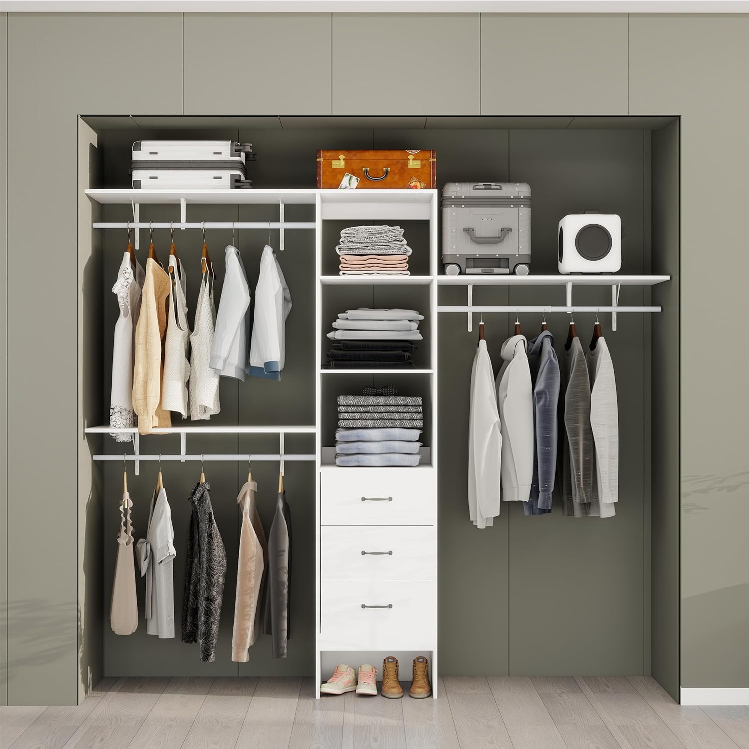 Adjustable Closet Organizer System: With expandable hanging rods and cuttable shelves, the clothes rack with drawers can flexibly adapt to closets from 5 ft to 8 ft wide. The shelf tower on both sides has 4 heights for adjustable mounting, and the shelf can be mounted at top height if you need to hang long coats or dresses. The open shelves can also be adjusted to 5 heights, which is convenient for storing various items of different heights, such as handbags, watches, jewelry, and mirrors.