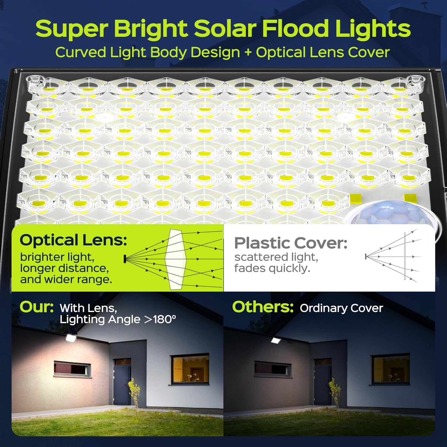 【128 LEDs with Optical Lens】This solar flood light boasts 128 high-quality LEDs emitting bright 6500K light. Hexagon optical lenses focus the light for increased brightness and refract it to extend the illumination range and distance. The color rendering index 80+ ensures that objects are displayed in their truest colors, and improves visibility in nighttime environments.