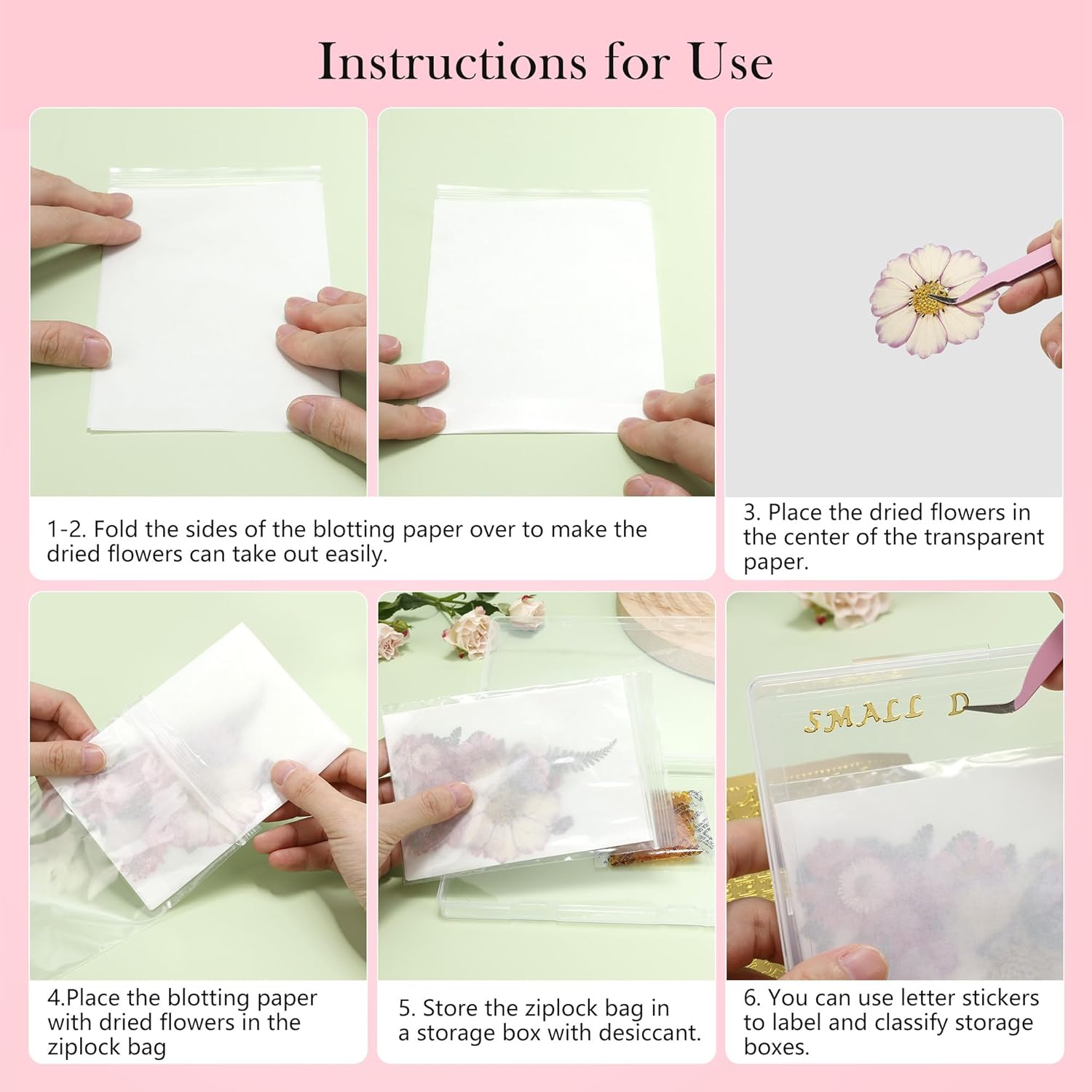 Complete Storage Package: The flower press storage set contains 4 x transparent plastic storage boxes for sorting and storage of different kinds of dried press flowers. 50 x zip-lock bags to ensure a tight seal, 50 x blotting paper to block light, 4 packs of desiccant for strong drying, and letter stickers. All-round care of dried flowers, maintain its dry state and bright color, one-stop to meet the needs of dried press flowers storage【not include flower】
