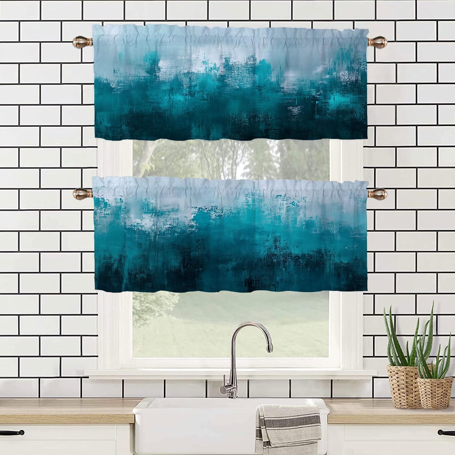 Abstract Turquoise Kitchen Curtains Set of 2 Teal and Grey Art Painting Rod Pocket Decorative Small Window Curtains Valance for Cafe Living Room Bathroom Window Treatment Valances 54x18in