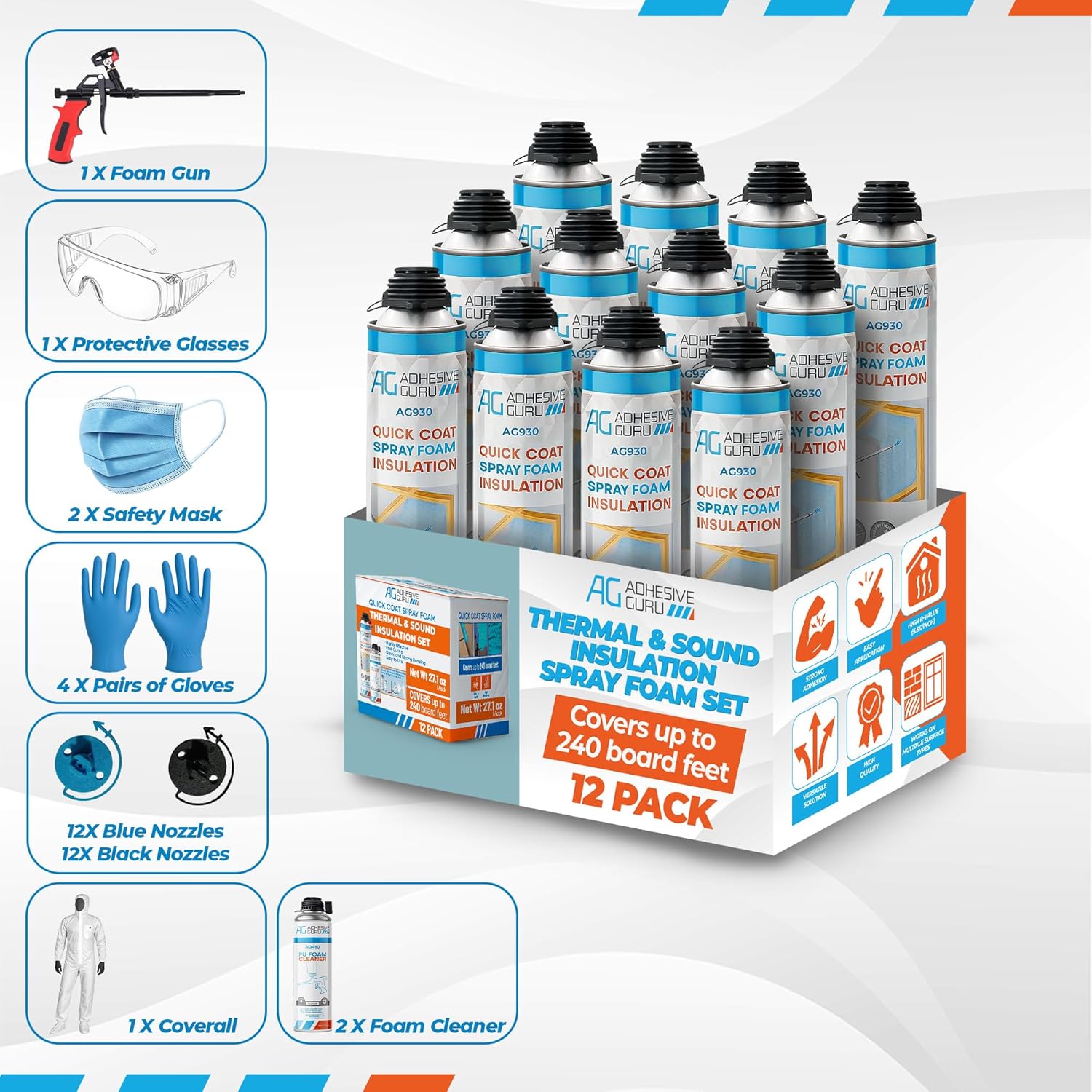 Box Contents: Adhesive Guru Spray Foam Insulation Kit includes; 12 INSULATION FOAM CANS, 2 FOAM GUN CLEANER, 1 DISPENSING GUN, 1 SAFETY GLASSES, 4 PAIR OF GLOVES, 1 COVERALL, 2 FACE MASKS, 12 BLUE AND 12 BLACK NOZZLES.