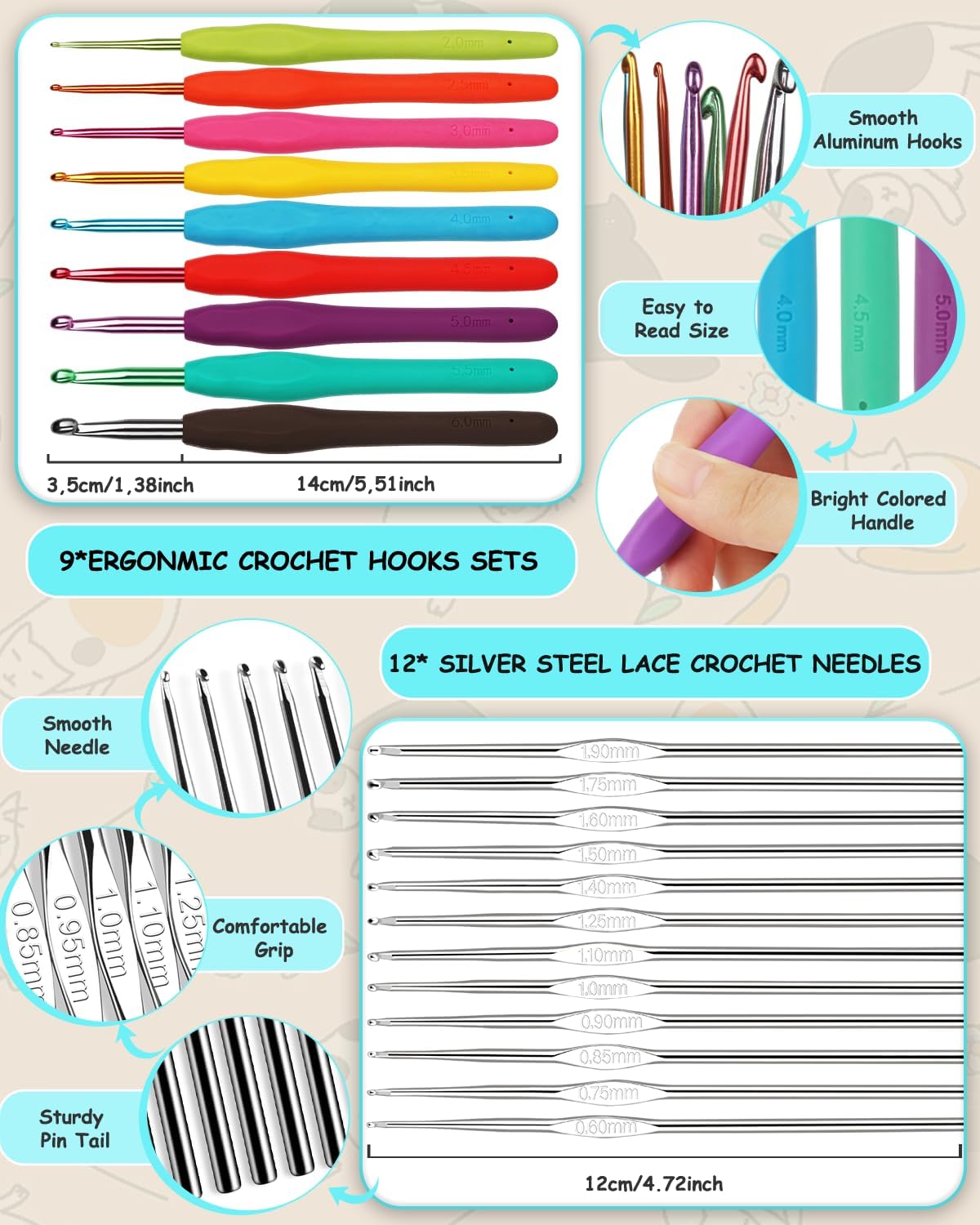 [Complete Crochet Kit] This crochet hooks kit includes 69 pcs different crochet hooks and crochet accessories: 9 ergonomic soft handle crochet hooks (2.0-6.0 mm), 12 lace crochet hooks(0.6-1.9 mm), 15 balls of yarn, 10 stitch markers, 6 plastic sewing needles, 4 plastic U-shaped needles, 3 plastic cable needles, 3 stitch holders, 2 pompom makers, 1 needle gauge, 1 scissors, 1 tape measure, 1 winding board and 1 blue cat storage bag. Complete crochet kits for beginners and adults.