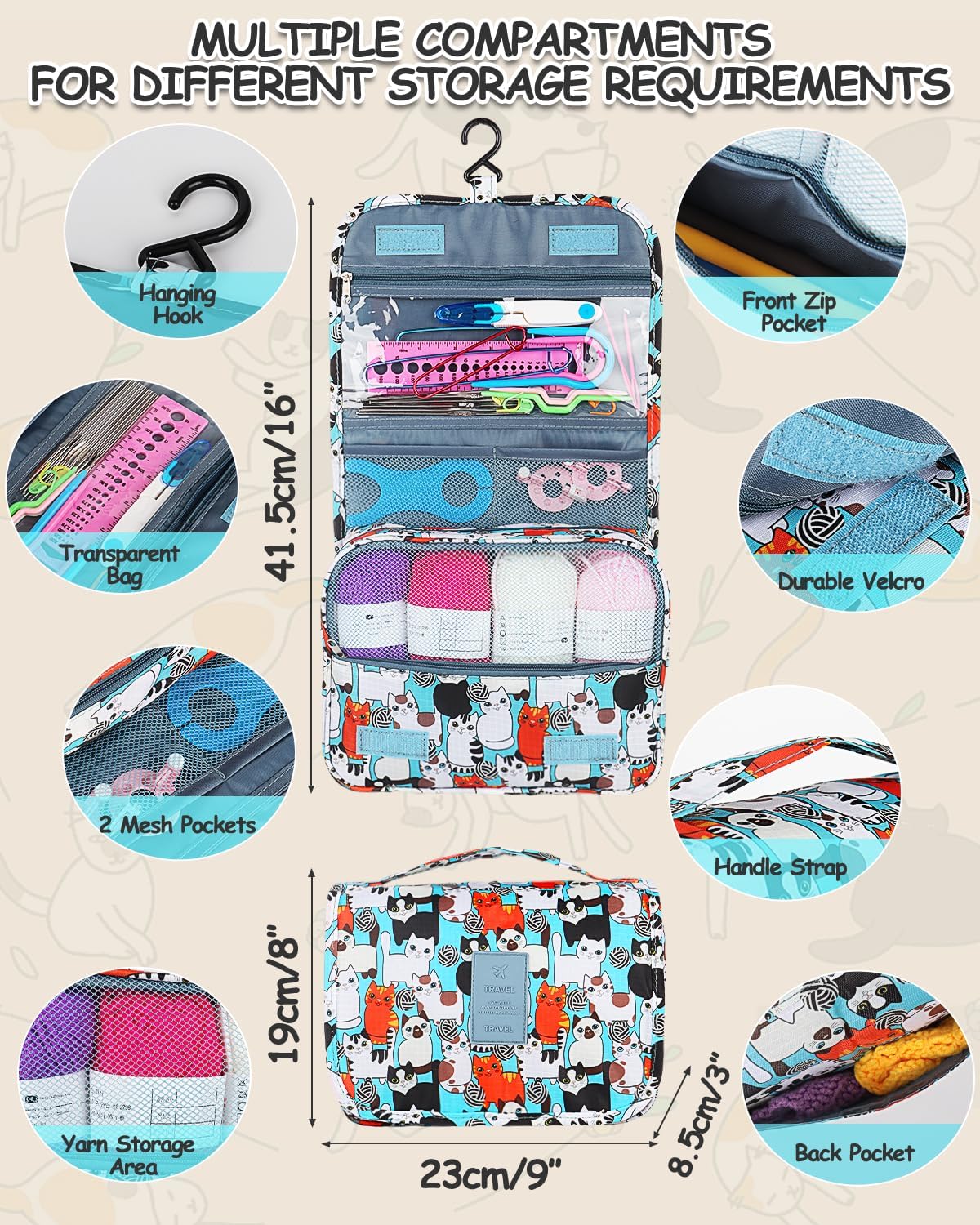 [Crochet Hook Set with Case] All items are placed in a zip organizer bag to keep everything neat and organized to avoid loss. There are small pockets and mesh compartments inside to store some sharp gadgets and prevent stabbing your hands. The storage bag has a side handle, which is very convenient to hold. Compact and the right size crochet hook storage bag, which makes it super easy to take anywhere you go. Great for travelling with projects, but also for storing makeup or toiletries, etc.