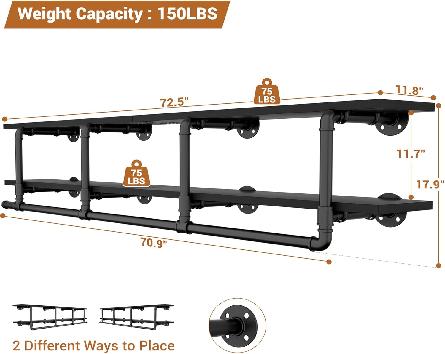Aheaplus Industrial Pipe Clothes Rack with Top Shelf, 73In Space-Saving Wall Mounted Clothing Rack, 2 Tiers Heavy Duty Pipe Clothing Shelves with Hanging Rod for Laundry Room, Closet Storage, Black