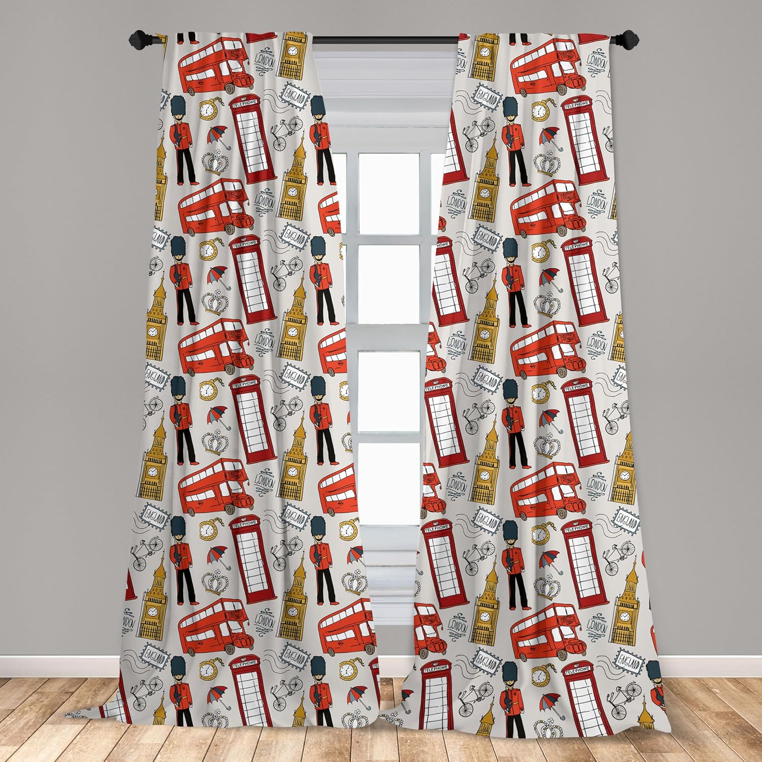Ambesonne London Curtains, Doodle English Crown London Cab Telephone Booth Watch Big Ben Umbrella Bicycle, Window Treatments 2 Panel Set for Living Room Bedroom, Pair of – 28″ x 84″, Multicolor