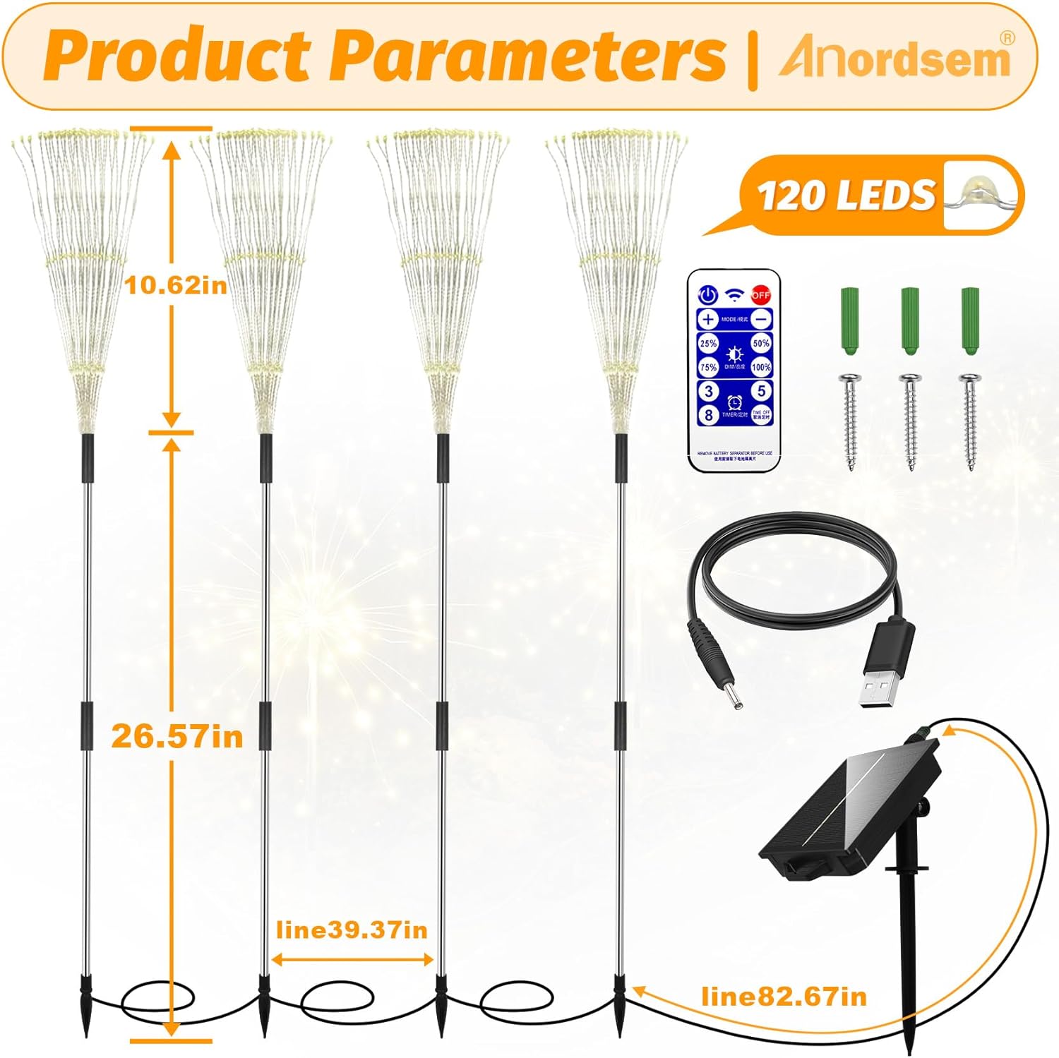 Anordsem Solar Fireworks Lights Outdoor: 4 x Bendable Copper Wire 120 LEDs String Lighting – Waterproof DIY Warm Decoration for Yard Garden Proch – Gardening Gifts for Garden Lovers