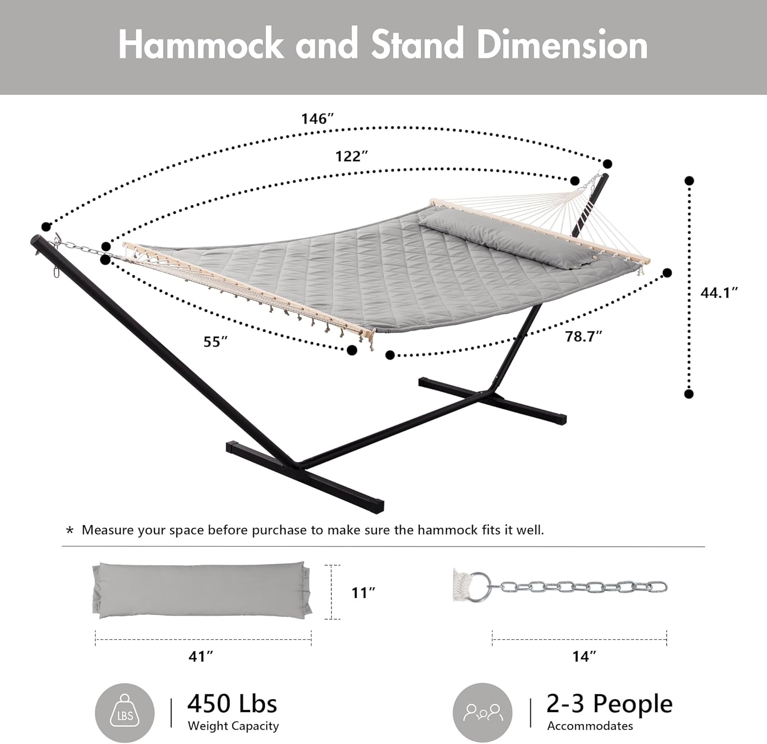 TWO PERSON HAMMOCK: The size of hammock bed is 78.7×55 inches. Designed for families, with 450 pounds weight capacity, this hammock can support 2-3 persons. You can enjoy a leisure time on the hammock with your mate, your children, and your friends