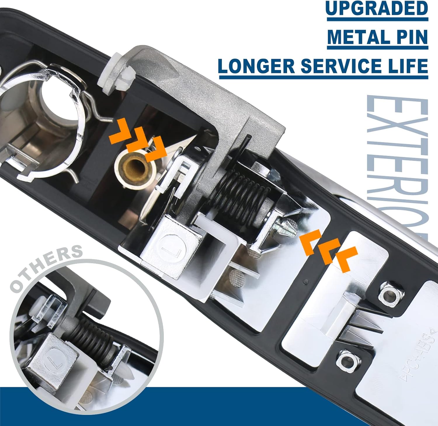 Over time the original factory outside chrome door handles come with the vehicle will worn out and fail. The APPERFiT exterior door handle replacement kit is thoughtfully desinged to guarantee an exact match with the genuine oem dimensions and specifications. These outer door handle repair parts are made from high-quality material, designed to withstand daily and maintain its appearance and functionality in the demanding conditions often encountered by pickups trucks.