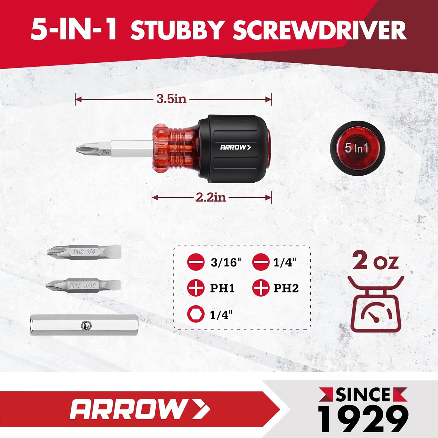 Stubby Screwdriver: The 5-in-1 stubby screwdriver includes two double-headed bits: Phillips (PH1, PH2), slotted (3/16″, 1/4″), and a 1/4″ hex socket. This compact tool fits different screw types. It’s ideal for professionals and home users. It also helps keep your toolkit simple