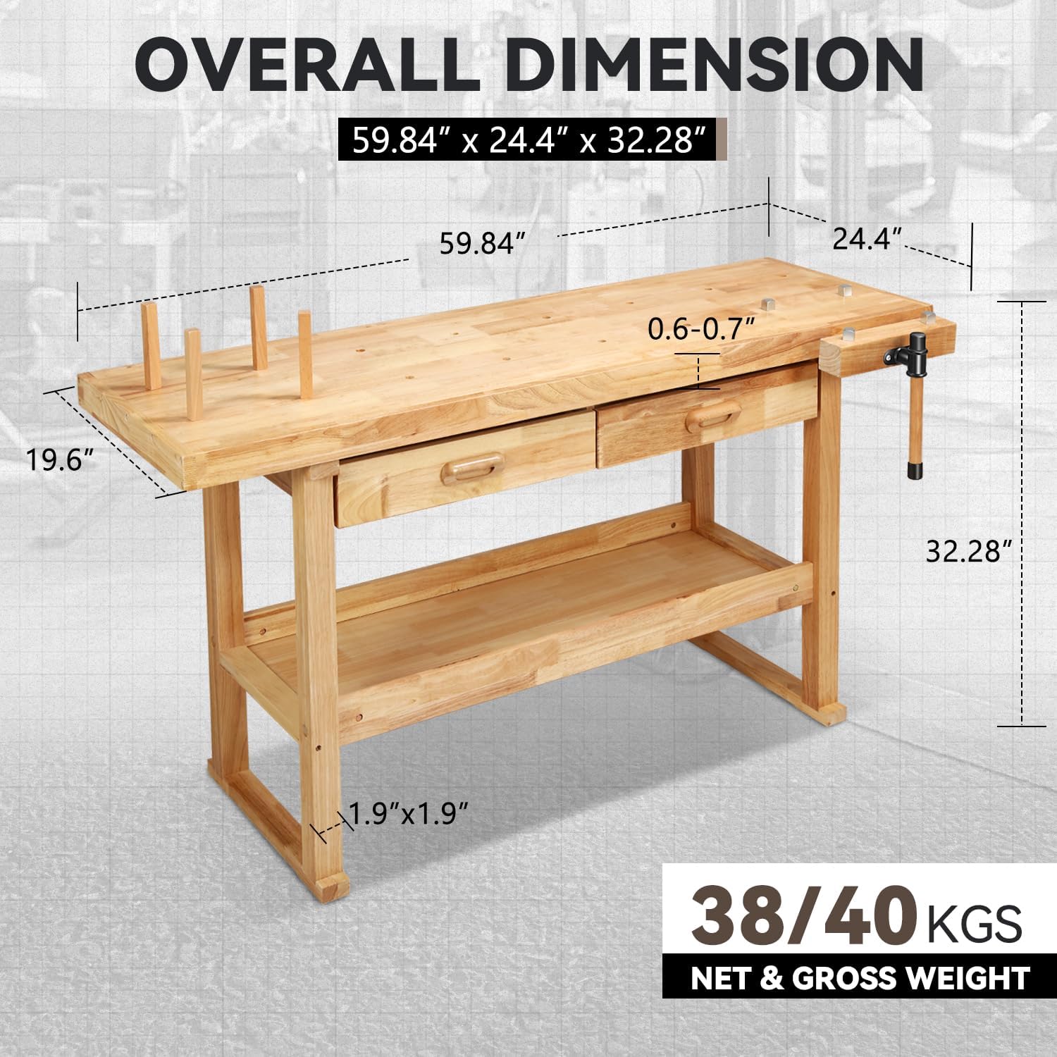 High Quality: Our workbench is crafted from hard Rubberwood, which can support up to 500 lbs in capacity, featuring adjustable rotating handles and a heavy-duty top, making it a functional bench, ready for any garage or professional workshop.