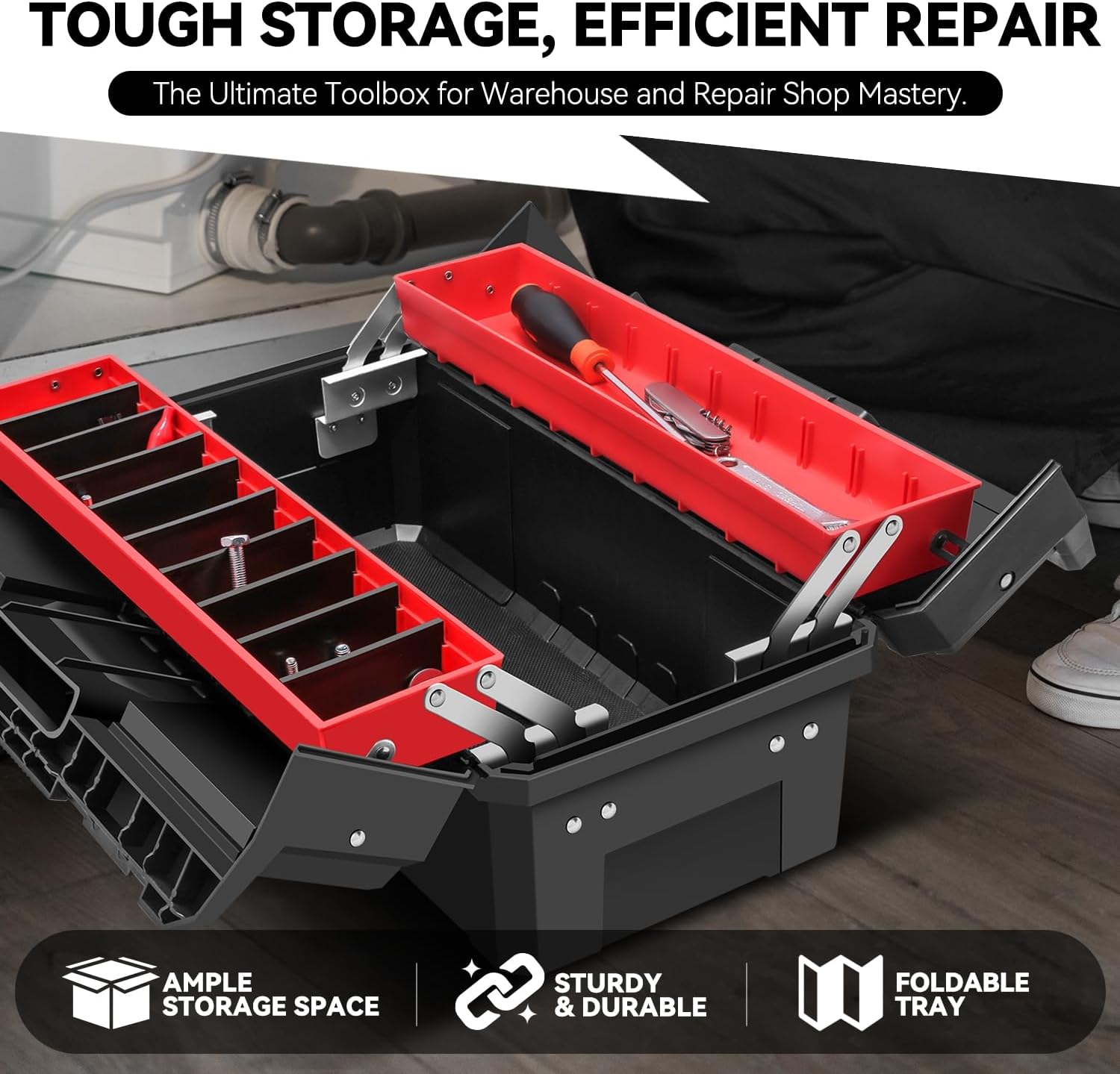 Auto Dynasty Tool Box Set Portable 2-layer Folding Toolbox with Non-slip Handle Tray for Garage, Workshop and On-the-Go Repairs, Red/Black