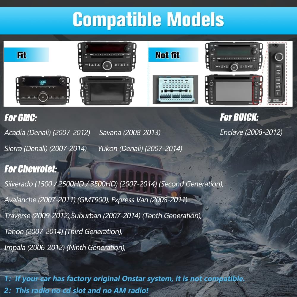 🚚【Bluetooth & FM Radio】For GMC Sierra Yukon Radio with Bluetooth, support phonebook synchronization, hands-free call and mobile music streaming. The built-in microphone picks up your voice and your car speakers let you hear the person on the other side. With FM radio, you can transmit the radio to the car stereo via FM to enjoy the original car stereo, you can listen to real-time traffic, news broadcasts, weather forecasts etc.