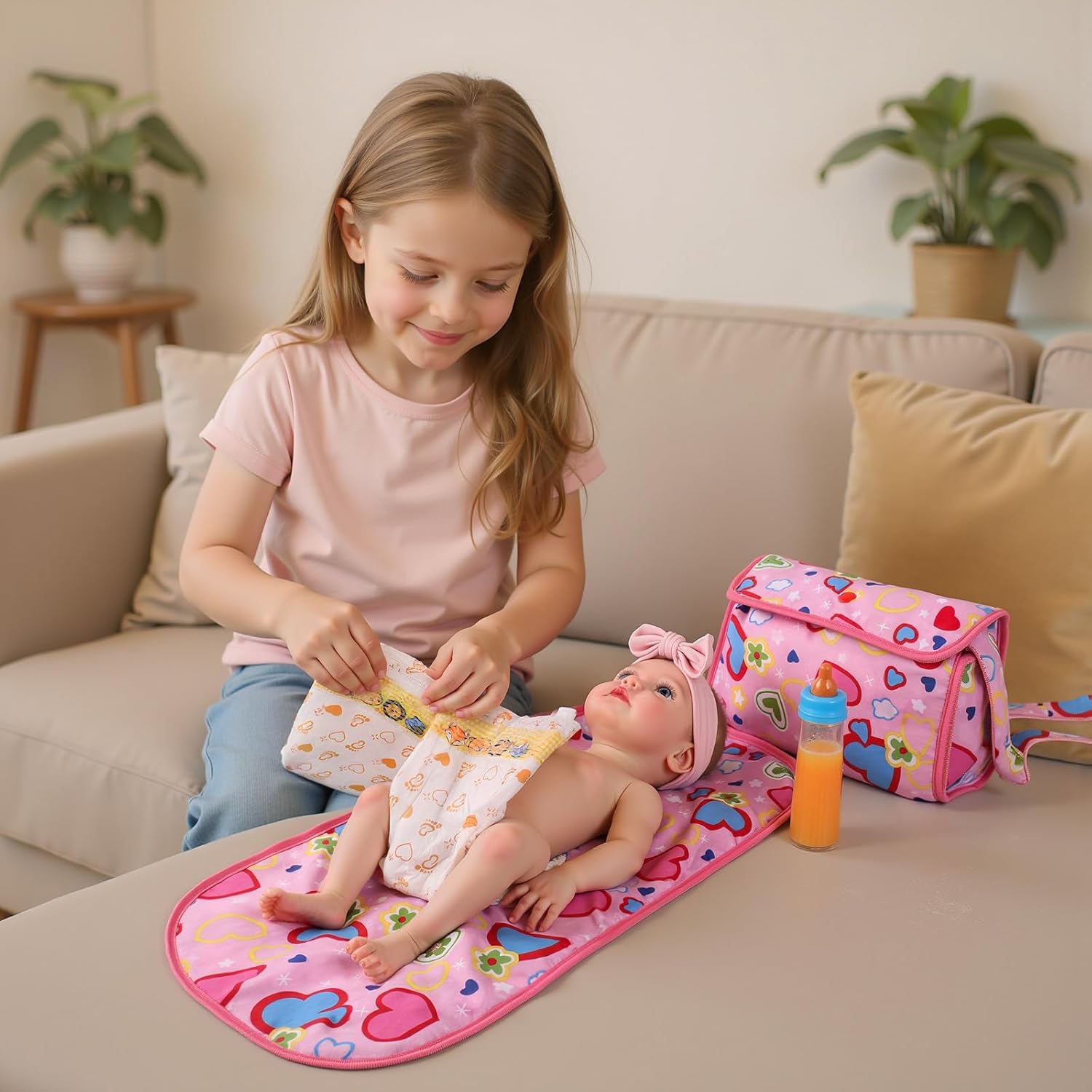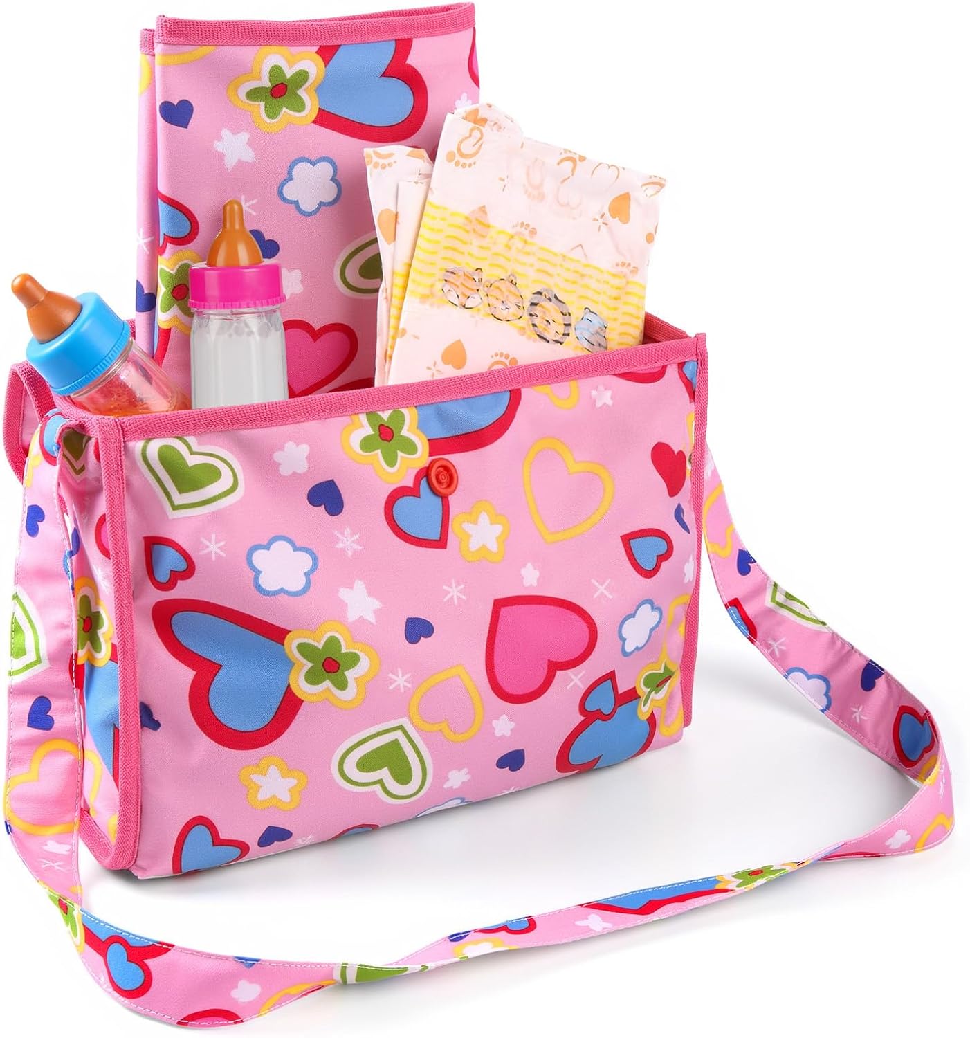 Doll Care and Feeding Set: Designed for pretend play, our baby doll diaper bag comes with a foldable changing mat, diapers and disappearing‑milk bottles—perfect for kids to change and feed 17–22 inch dolls anywhere.