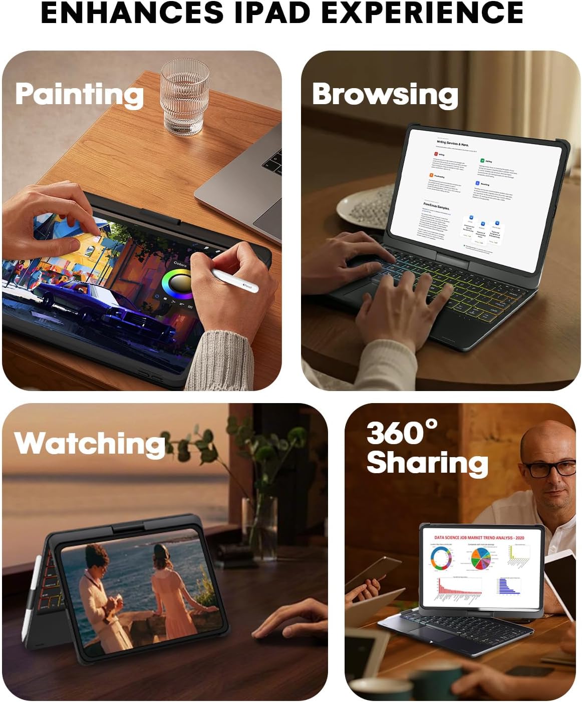 【Rainbow Backlits&Long Battery】iPad Air 11 inch case with backlits ensures you don’t have any trouble while typing in low-lit environment. iPad Air 5th keyboard lights up with different colors and can be turned up brighter or dimmer as needed. 500mAh large rechargeable battery offers up to 200 hours of use (backlit off) and 3 hours (backlit on). Stay productive without interruptions whether you’re working late or traveling.