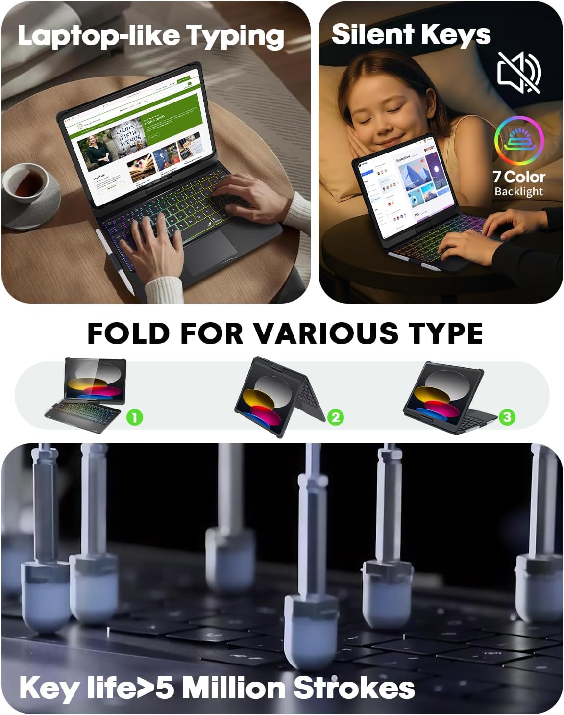 【Responsive Typing &Premium Keys】iPad 10th generation case with keyboard experience laptop-like typing with responsive keys and a tactile feel.Laptop-like keys, thin and large-sized, deliver quiet typing—ideal for classes, libraries, and bedrooms. The dedicated function keys let you control brightness, volume, and media playback directly from the keyboard for iPad 10th generation. Perfect for work, study, or entertainment.