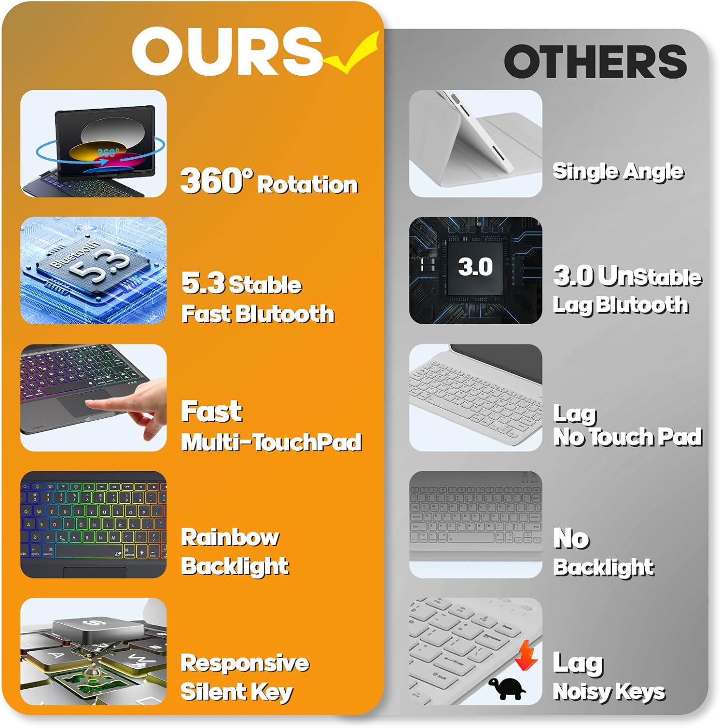 【5.3 Fast Chip &Stable Connectivity】- Keyboard case for iPad 10th powered by a premium chip, delivers 3x faster connection. Ensures seamless typing-touch syncwith ensures instant, lag-free typing that perfectly syncs with every touch.Swift and stable Bluetooth pairing ensures an uninterrupted user experience, keeping you productive on the go.whether you’re taking notes, working on documents, or browsing. No more frustrating delays or dropped connections