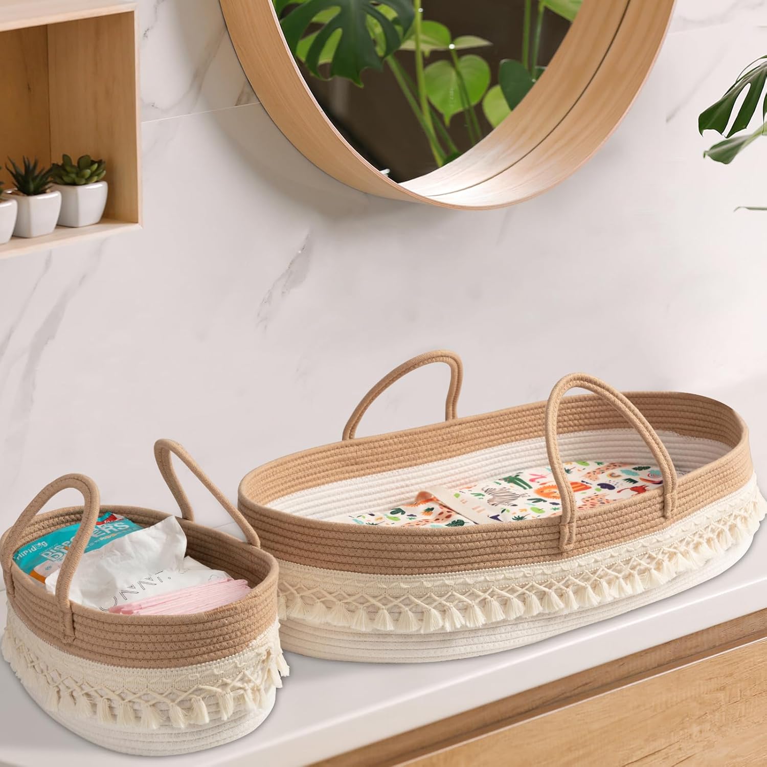 Chic & aesthetic: The baby changing basket showcases bohemian style with white tassels and cream mixed brown body, which add elegance to your home. Diaper baskets in the same color scheme are perfect for storing diapers, wipes, creams and more