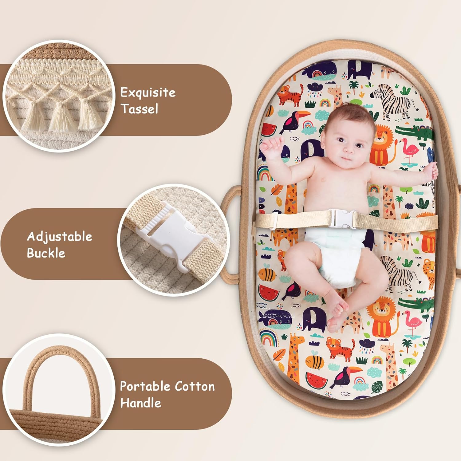 Baby Changing Basket, Boho Moses Baskets for Newborn, Baby Basket for Baby Dresser, Diaper Changing Basket for Baby with Diaper Caddy, Cartoon Changing Pad, Waterproof Sponge Cushion, Storage Bag