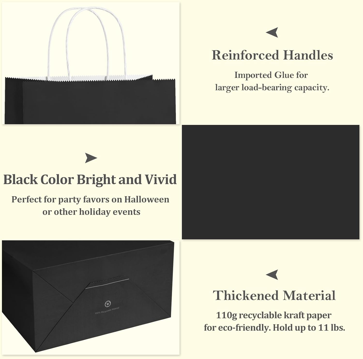 These BagDream kraft paper bags are exactly what I needed for my small business! The quality is impressive â theyâre thick, durable, and the handles are well-attached and strong enough to hold heavier items without tearing.The clean white finish makes them super versatile â great for branding with stickers, stamps, or logos. Iâve used them for retail packaging, party favors, and takeout orders. Love that theyâre eco-friendly and recyclable too!Excellent value for a 100-pack. Iâll definitely be reordering!