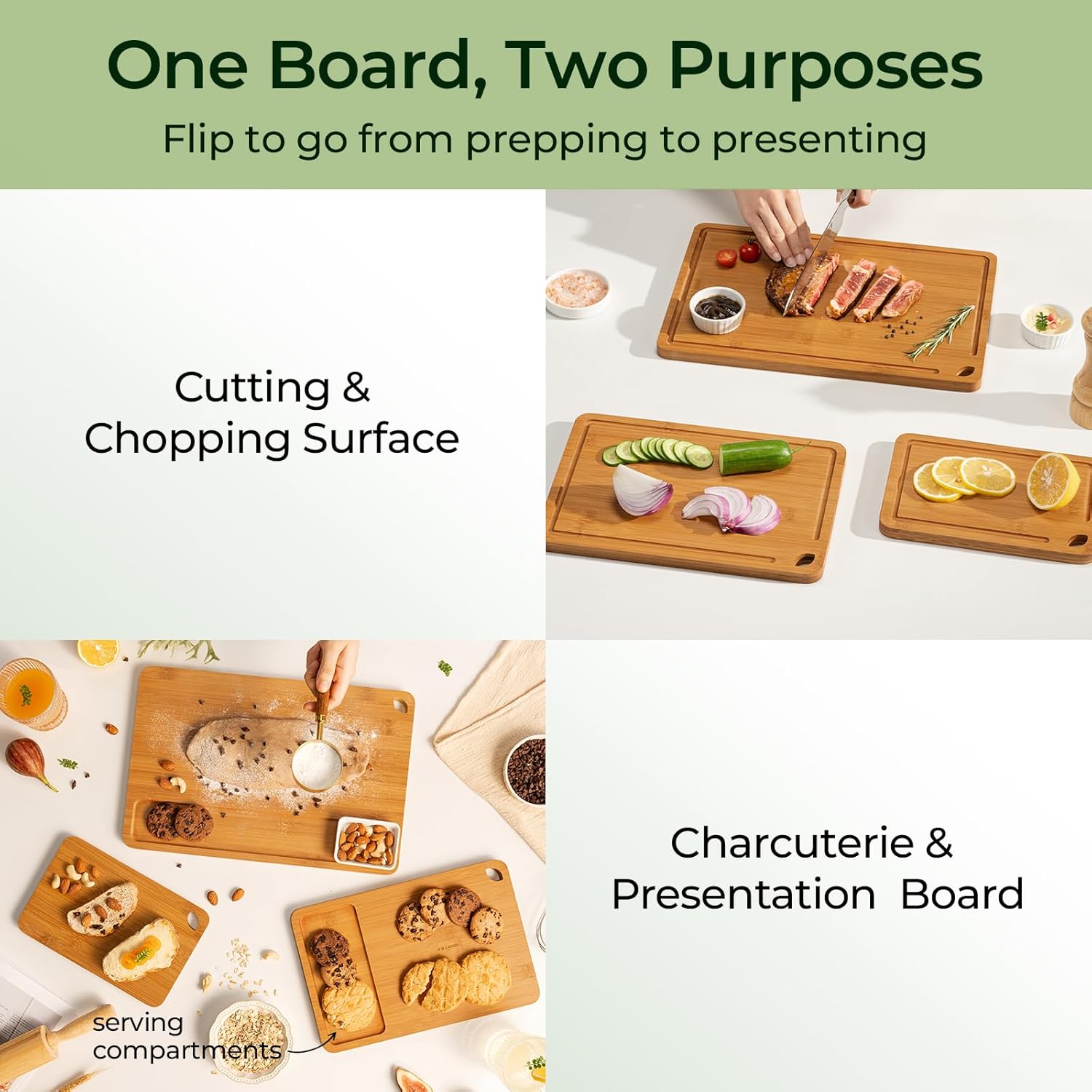 𝐁𝐞𝐧𝐞𝐟𝐢𝐭 𝐎𝐮𝐫 𝐇𝐨𝐦𝐞 – Keechee’s cutting board set is crafted from sustainably harvested quality bamboo forests(Bamboo grows quickly and a single bamboo can be harvested multiple times). Known for its natural strength and eco-friendliness, our bamboo provides a durable and environmentally responsible choice for your kitchen.