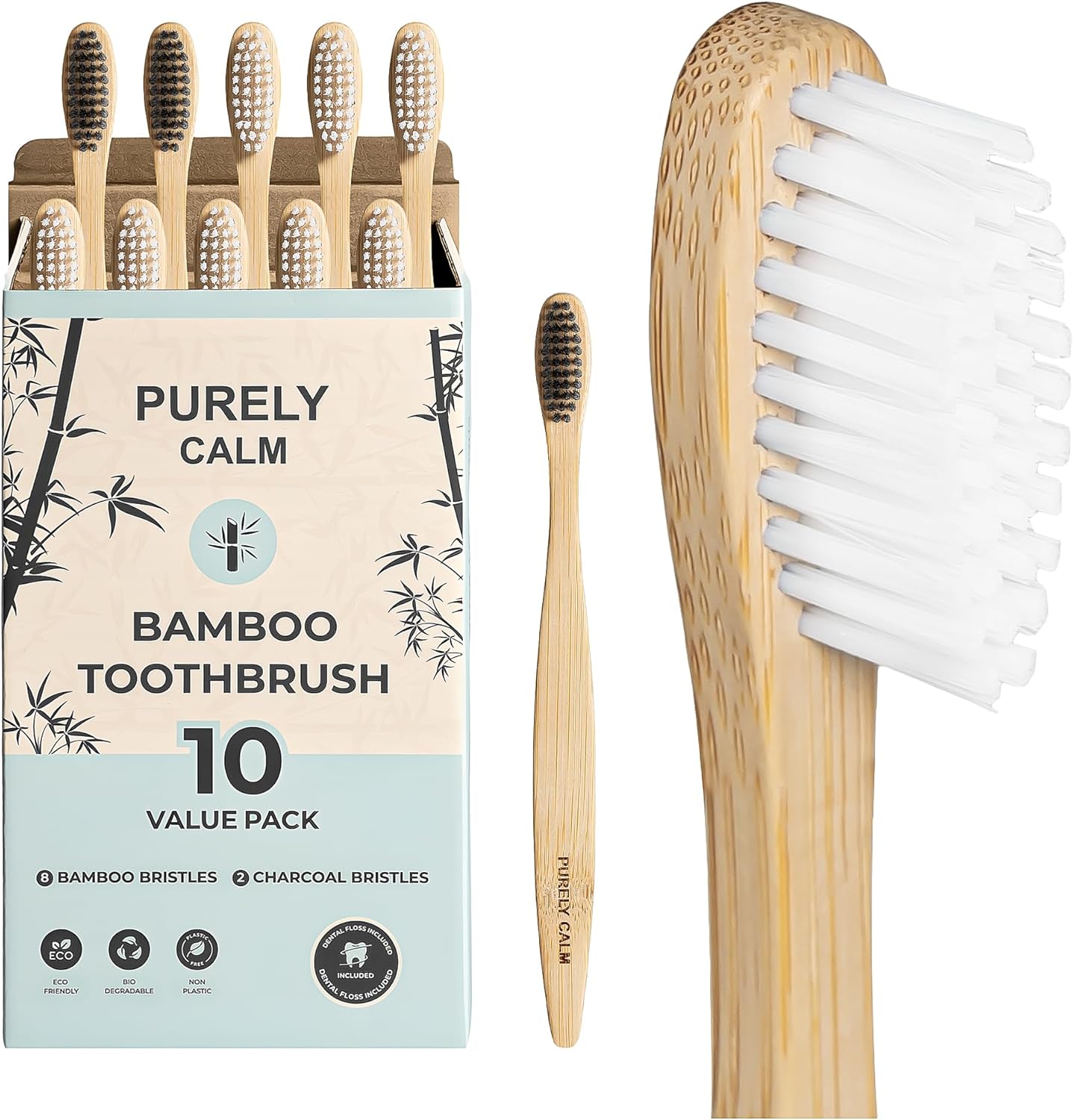 If biodegradable and eco-friendly are your priorities in a toothbrush, then the Purely Calm bamboo toothbrush is for you. If cleaning your teeth is the priority, these will not be your best bet.They come individually wrapped with a bonus spool of eco-friendly dental floss, which is a nice touch. 2 of the 10 have carbon infused bristles, but wrappers are not marked. If you look closely under bright light, you can make them out without opening the wrappers.Taking one from a wrapper, first thing I noticed was the bristles were a bit smushed. They are a tight fit in the box so expect they all have some degree of it. The wood is nicely finished and smooth, the handles give good grip. The total bristle width is relatively narrow, and the head is a bit large for the bristle area. Part of that is the head does not taper toward the top as is typical to reach back corner molars.I was struck by how soft the bristles were. I missed the manufacturer calling out Ultra Soft for firmness. That is a very accurate description. For comparison, I normally use a Colgate soft toothbrush and the Purely Calm is quite a bit softer with finer bristles.After two brushings, the bristles did partially fluff back up, but still have some bend. The narrower row of bristles wasn’t an issue, but the larger head is not ideal. The wide leading edge gets in the way a bit in the back corners. The bristles are too soft, they simply don’t do the job as well, especially at the gum line. Brushing right after with my standard toothbrush, I could tell my teeth were cleaner. If you have super sensitive gums or temporarily need something very gentle after some dental work, these may work for you.The floss frays immediately on trying to get it thru tight gaps. Unless all your teeth have wide gaps, don’t expect to be able to use it.I am sure some tradeoffs may be expected with eco-friendly being the focus, but the tradeoffs here are too much. If I had to guess, I’d say 0 out of 5 dentists would recommend.