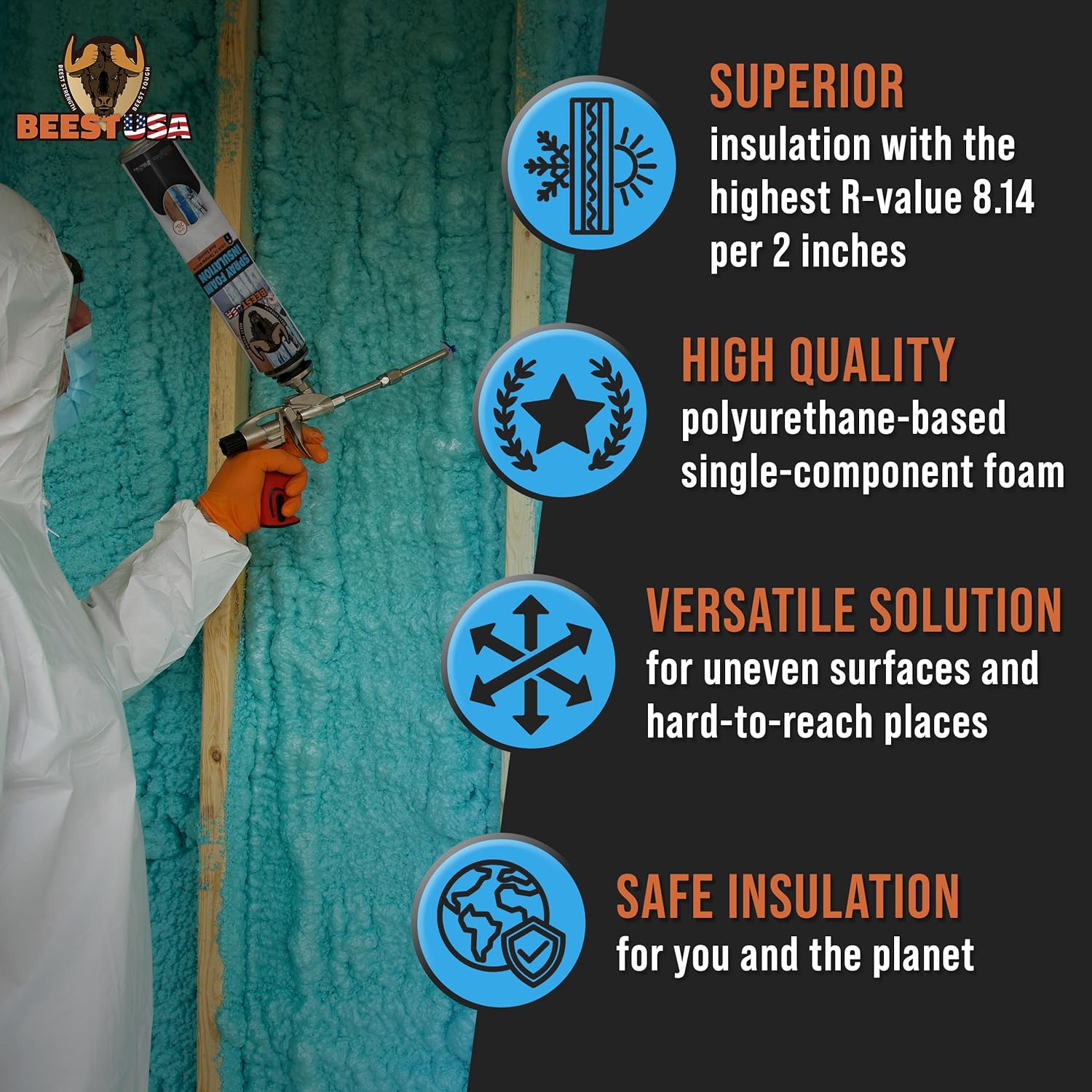 Beest High-Coverage DIY Spray Foam Insulation Kit (240 sq. ft.): Our wide spray foam insulation delivers exceptional thermal insulation (R-value 8.24/2 inch) and soundproofing. It is perfect for walls, ceilings, uneven surfaces, and hard-to-reach areas where traditional insulation falls short.