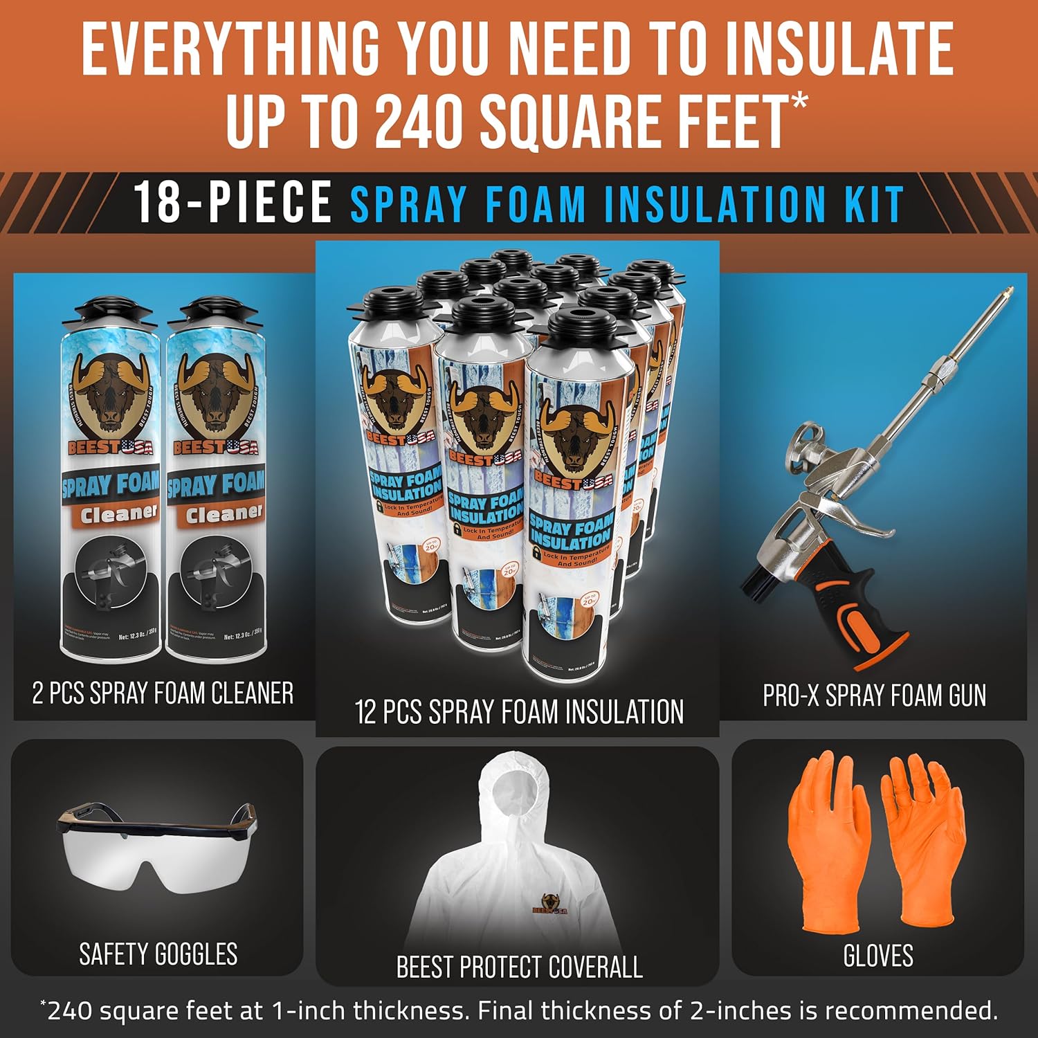 BEEST Closed Cell Spray Foam Insulation Kit for Wall & Attic, 240 Board ft/sq.ft Heat & Sound Insulation – Super Adhesive to All Surfaces – Spray Foam Can, Cleaner, Gun & Safety Gear