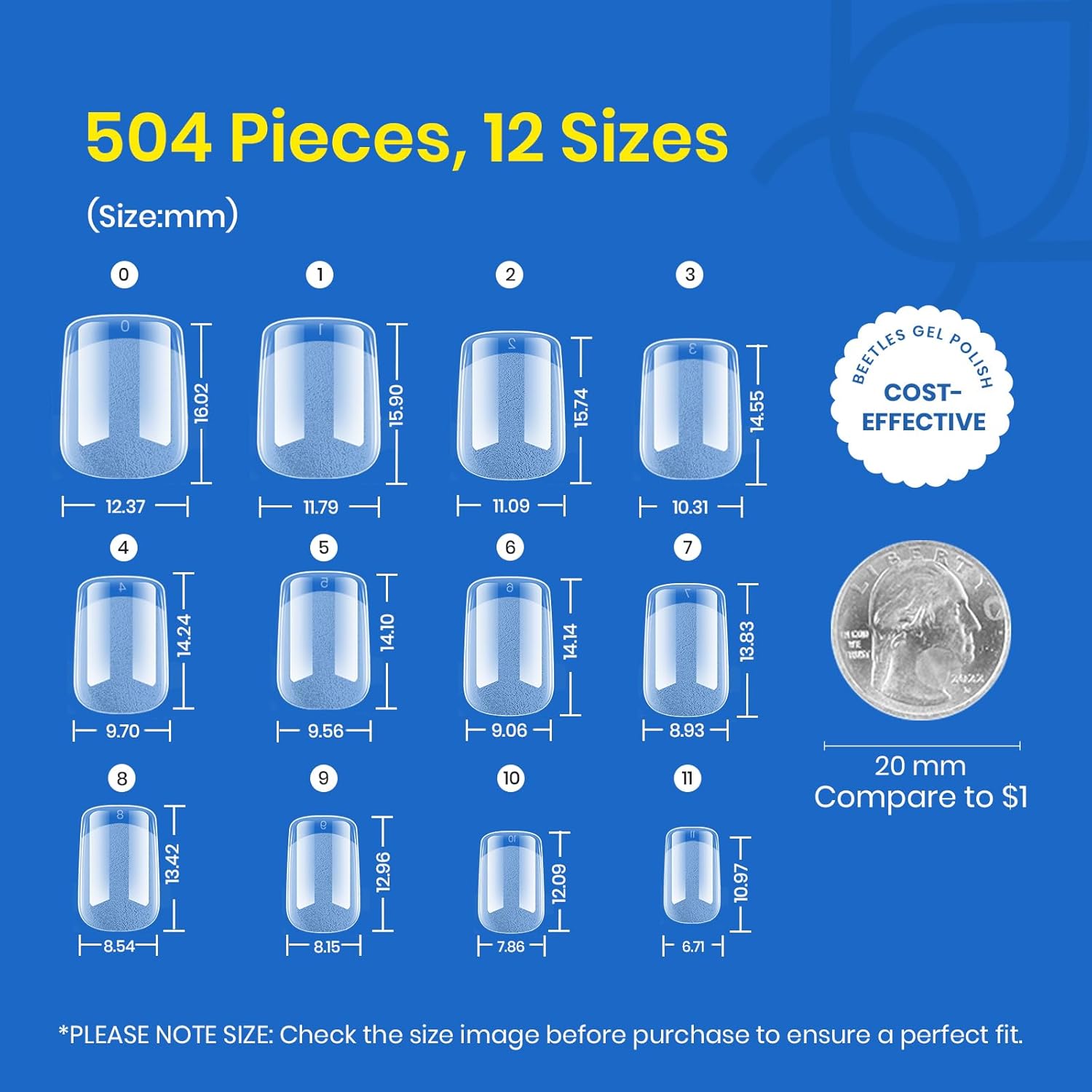Multiple Size Options: Our fake nail tips give you even more options. We provide 12 different sizes tips, they are marked with the numbers “0-11” to quickly find your size, 504 pieces in total. Beetles nail tips are easy to apply, suitable for professional manicurist and even nail beginners. Enjoy nail fun with your friend and family