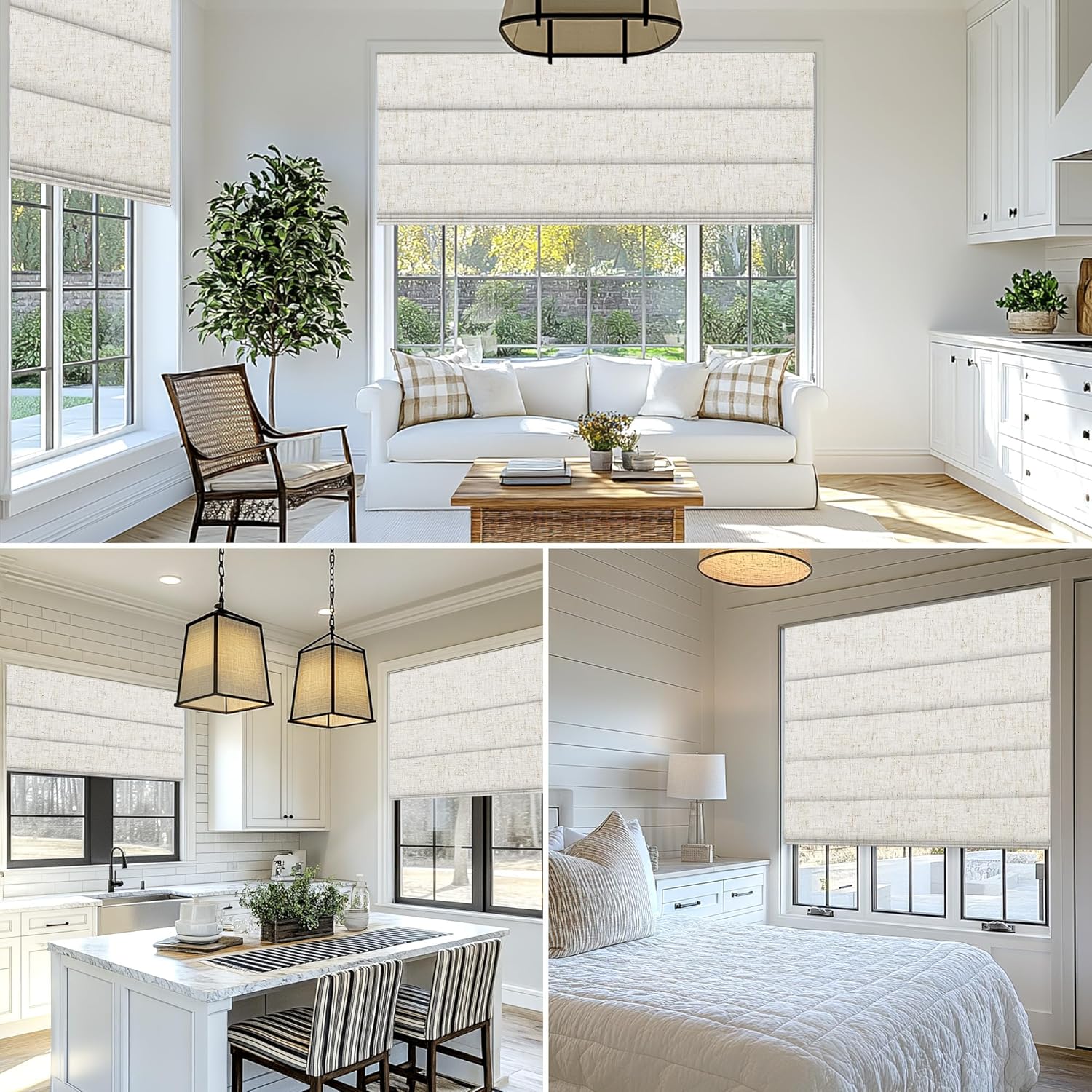 【Energy Efficiency】Made from 100% polyester, our blackout roman Blinds are handwoven using natural linen fabrics, layer them with curtains to enhance warmth and style while enjoying superior heat insulation, noise cancellation&thermal efficiency. Our roman blinds effectively block outdoor heat during summer and retain indoor warmth in winter. With blackout fabric, they reduce heat loss through your windows by 21%. Ideal for the living room, dining room, kitchen, office, or bedroom