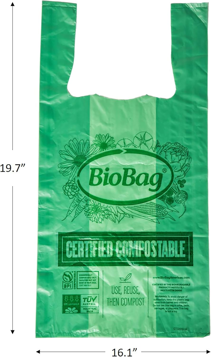 BioBag shopping bags are perfect for restaurants, farmers markets, grocery stores and all other retail. BioBag is the leading supplier of compostable bags across the globe, however, BioBag isn’t a large PE plastic bag company that now conveniently dabbles in the new world of compostable bags. We are a small company of dedicated employees, who are fully committed to ONLY producing Certified compostable bags and films. It’s All We Do! This product complies with California Law (SB 1972) and other state/local laws regarding compostable labeled products. BioBags are BPI certified to meet the ASTM D6400 specification. BPI Certification #891053. The ASTM D6400 is the North American equivalent of the European EN 13432. Both specifications require that compostable products completely decompose in a composting setting in a specific time frame, leaving no harmful residues behind. For best results: Use within one year of purchase; Store in a cool, dry place away from excessive heat. Try the fridge or freezer; Change out the used BioBag as often as possible. BioBags are star sealed at the bottom for extra strength to prevent leaking however, condensation may form when used in a closed container. BioBags are Manufactured in the USA with resin sourced from Italy. BioBags are BPA free. Certified compostable wording and the Biodegradable Products Institute (BPI) logo are visibly printed on each bag. Approved for use in green & brown cart communities that accept compostable plastics.