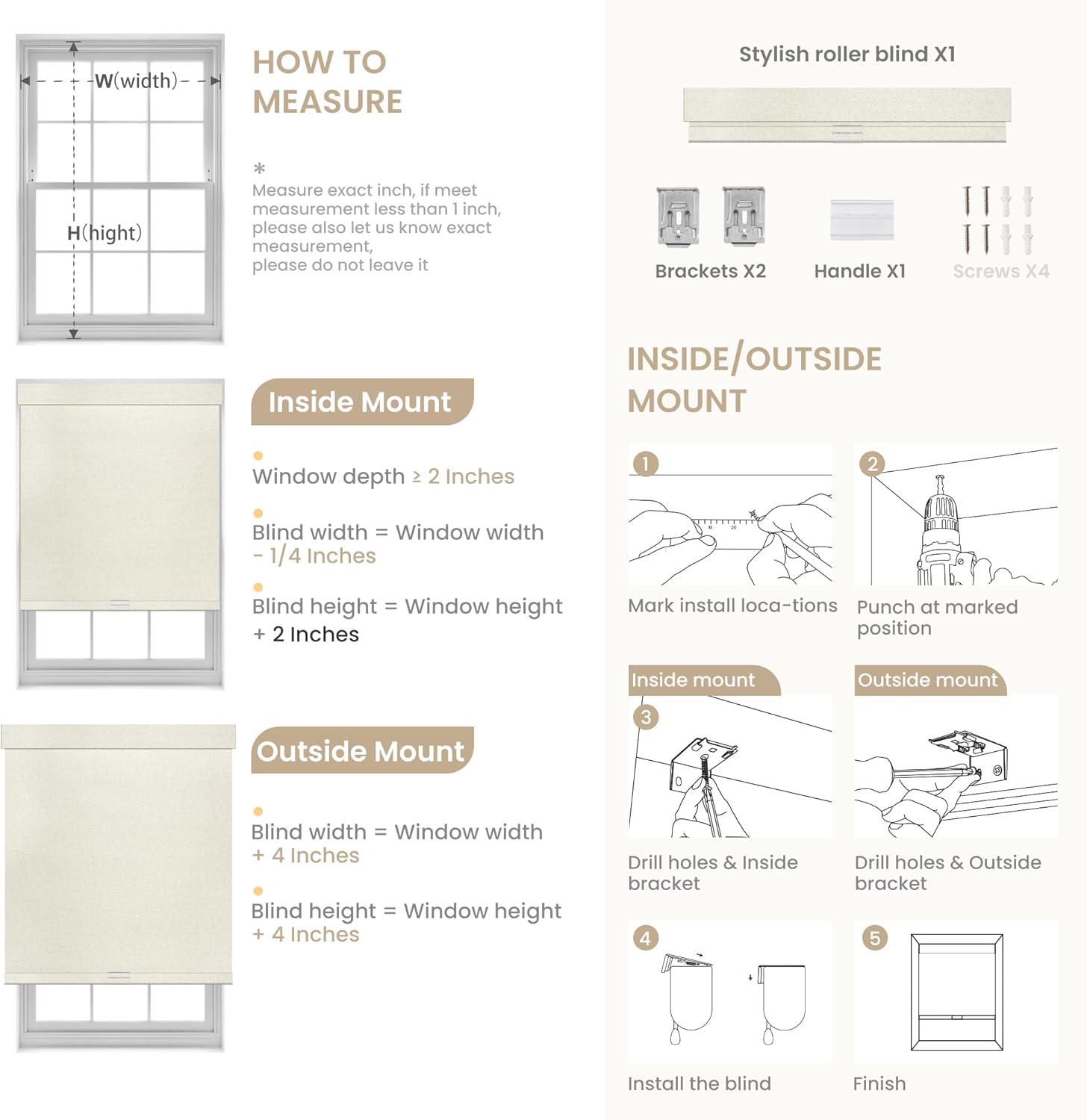 【Customize Size】 INSIDE MOUNTING roller blinds require a minimum 2″ window frame depth. Blackout roller window shades custom windows shades width need to be 1/4″ less than window width, The length of the shades is equal to the length of the window. OUTSIDE MOUNTING roller shades for windows need to be 4 inches wider and longer than window width and length for better coverage. If you can’t find the size you need on the page, please contact us and we will give you for a custom solution.