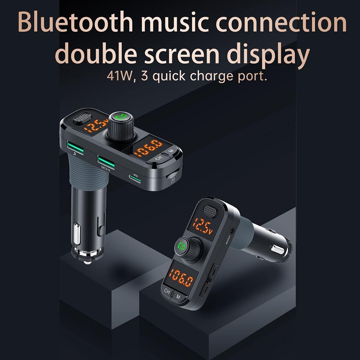 Coming with double-sided blind insert 1 QC 3.0 port (18W) , 1 Type C PD 3.0 port (18W) and 1 USB port (5W), Bluetooth car change offers drivers and passengers with 4 times faster charging.