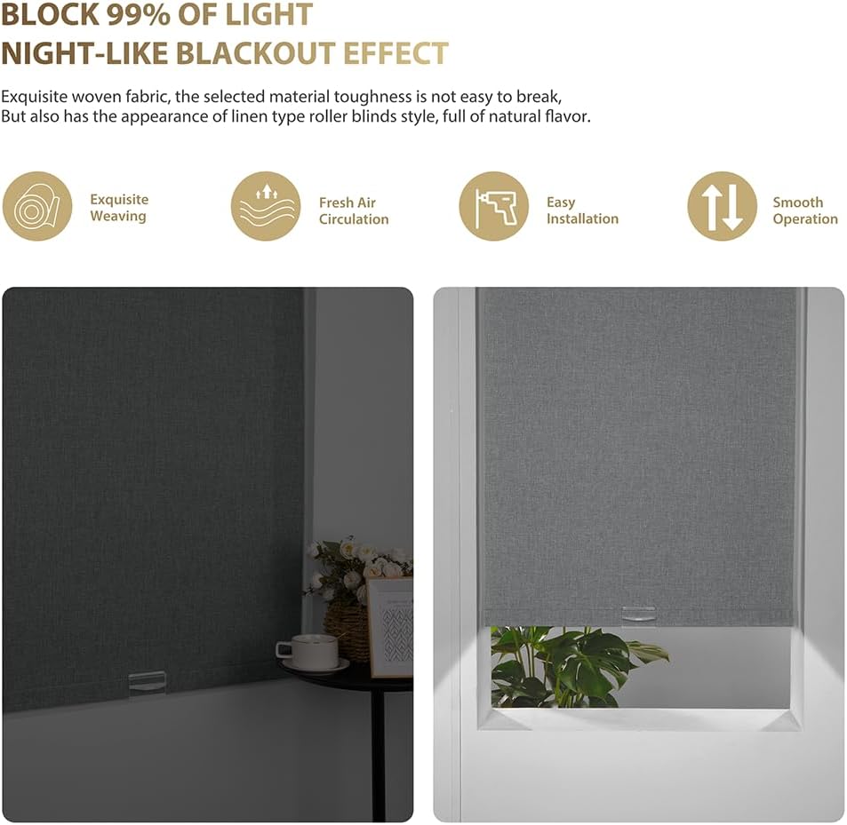 Boolegon Blackout Roller Shades for Windows Linen Fabric Cordless Roller Blinds with Cassette Valance Thermal Insulated Room Darkening Window Shades for Home Door,Linen Gray,Custom Sizes