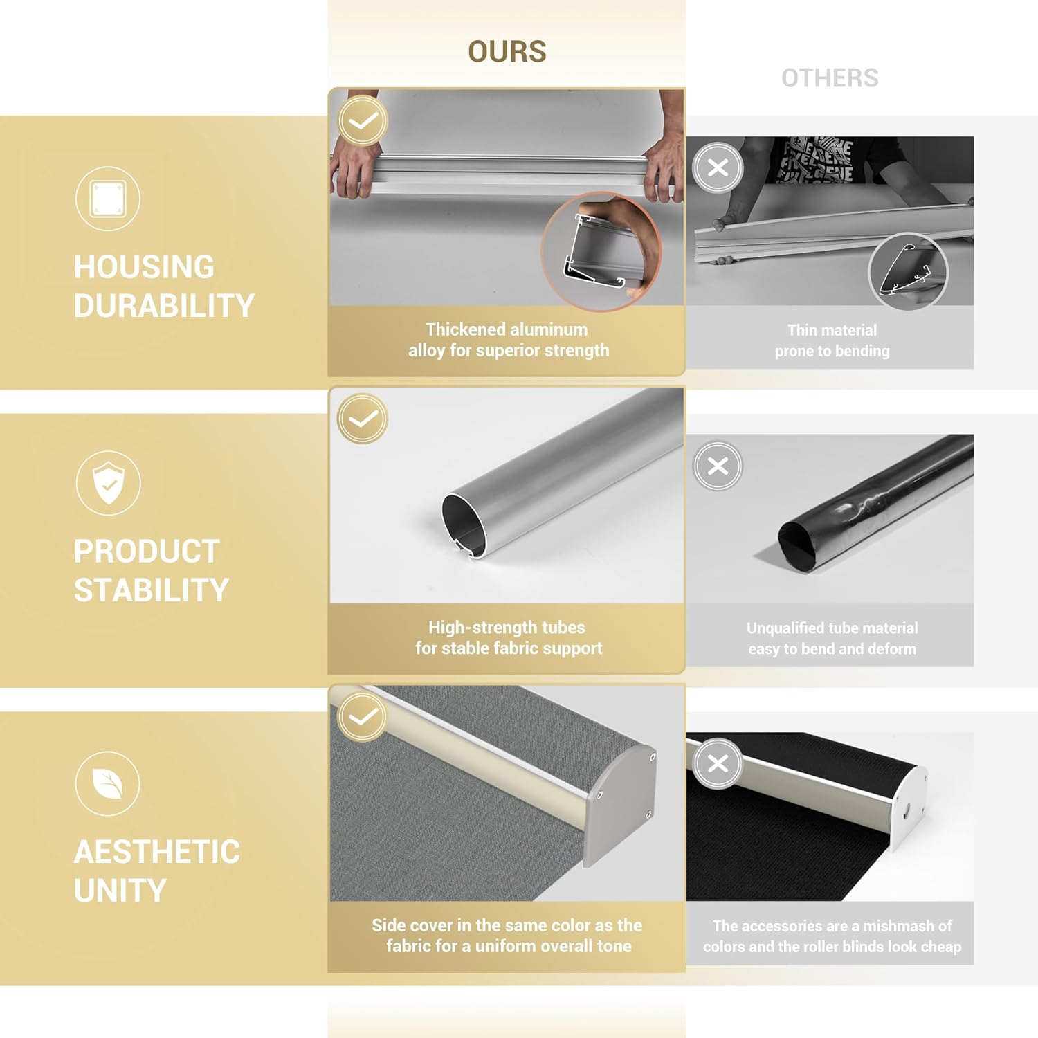 【Free Stop System】Black out shades system can protect your children or pets from harm. You just need to pull down or push up to stop at any position you want, not as difficult to control or as other devices.【38mm Roll Tube】The thickened roll tube is better stressed and offers more sizes to choose from. The rolled tube fits more closely to the fabric, making the gap between the fabric and the window frame smaller and providing better light blocking.