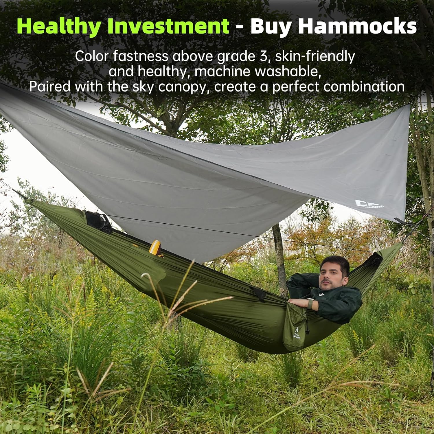 [Shelter from Sun & Rain] Are you still worried about not being able to camp because of the rain? Camping hammock with rain fly is equipped with a more intimate triangle design, your net hammock can be used in sunny and rainy days. It also protects your privacy. This is a great ideal present for you to travel with your friends and family
