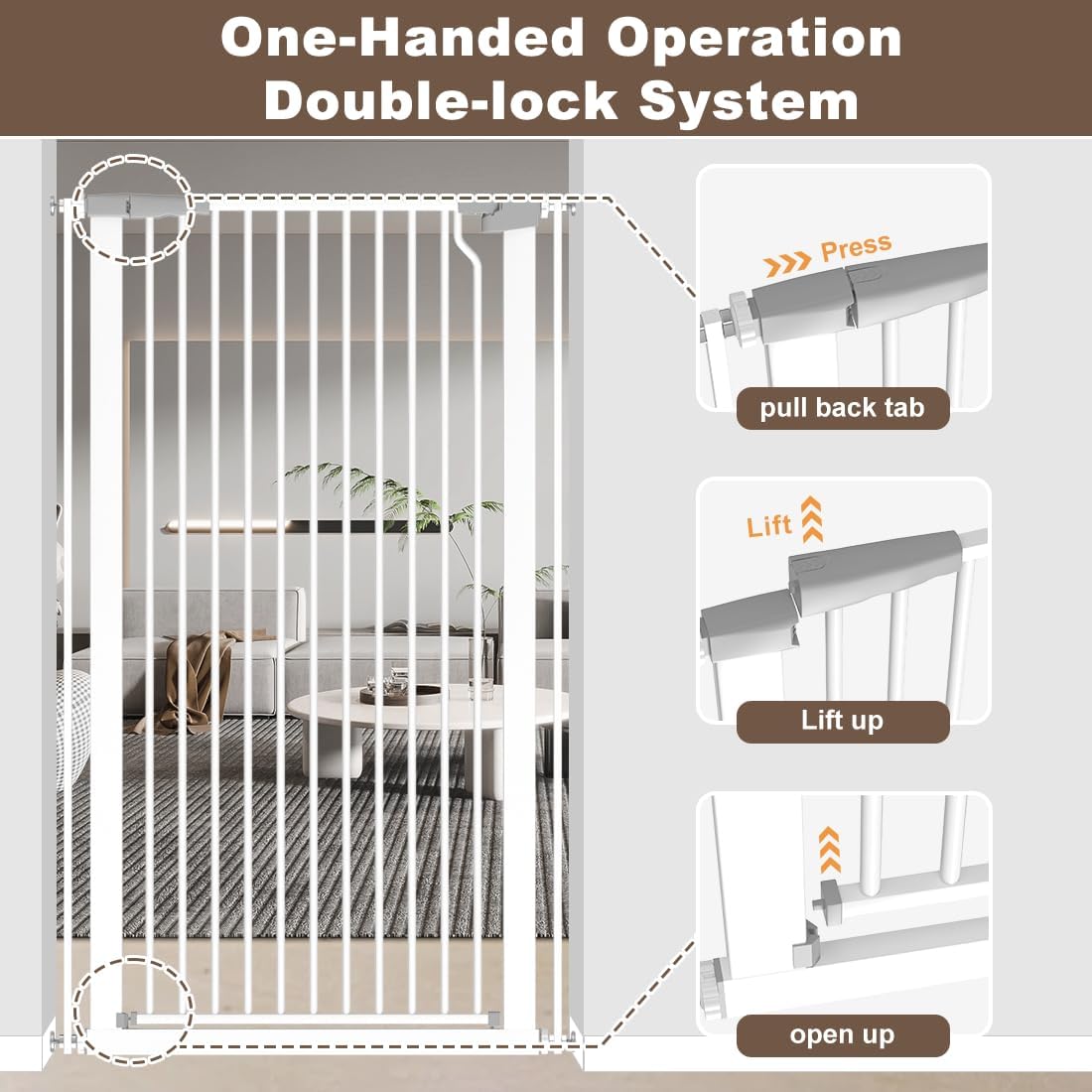 【Double-Lock Safety】 Keep kids & pets safely contained. Our double-lock baby gate prevents pushing open. Adults operate easily one-handed (press & lift) through child gates.