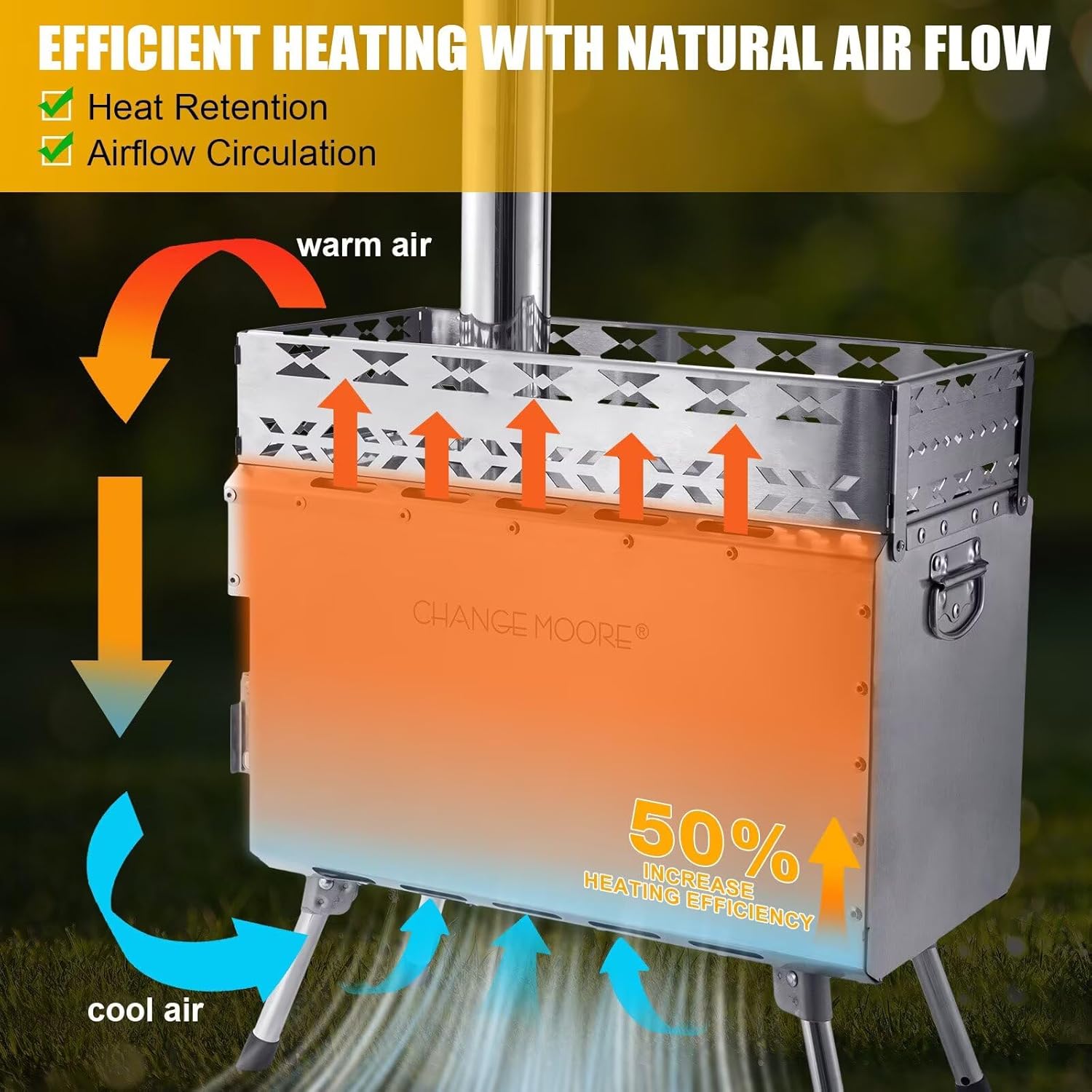 Upgraded Heat Concentration for Even and Long-Lasting Warmth: This sauna tent stove features an innovative heat concentration design, with an internal divider that directs heat through smoke conduction rather than direct flame contact. This ensures more even and long-lasting heat distribution, increasing heat utilization by 70%-80%, providing a highly efficient heating experience