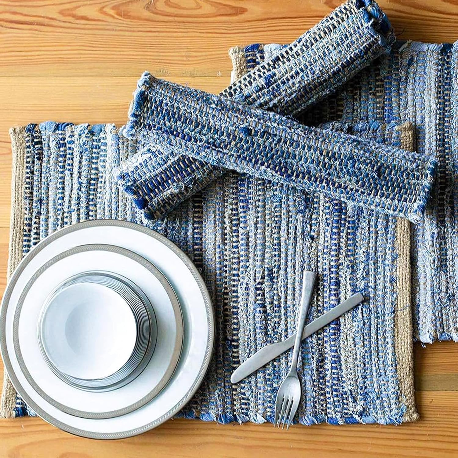 Received these today. The jute makes them spot clean only and they are quite “rustic “, can’t think of another term. Great value considering most other woven place mats are 30$/each. The denim is funky and quite casual. I bought 2 sets for under 40$ for that is a bargain for sure.