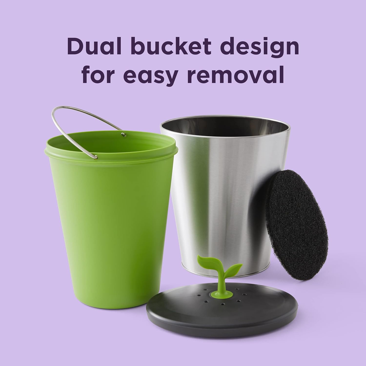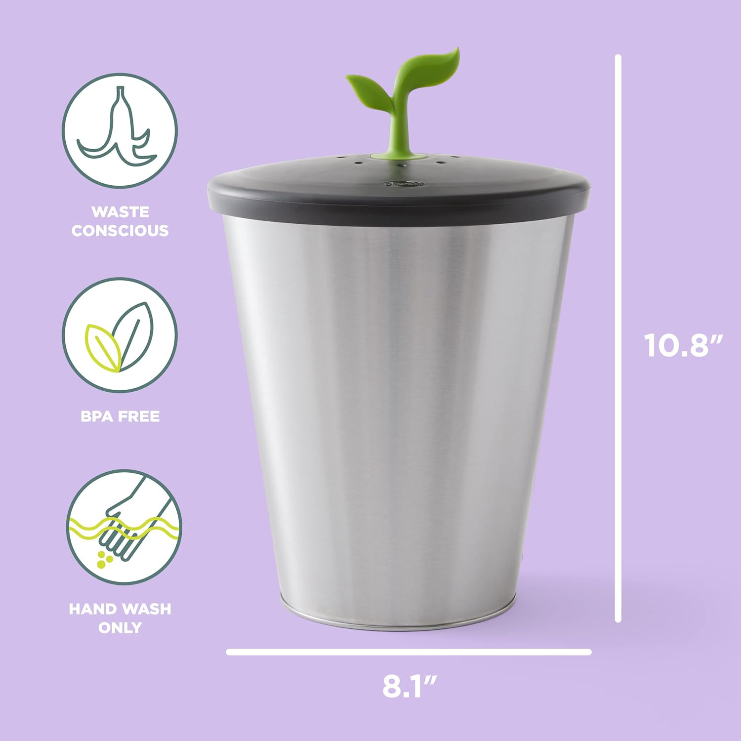 CONTEMPORARY DESIGN: Modern stainless steel countertop compost bin, featuring a vented lid, removable inner bucket, and a replaceable natural charcoal filter that traps and absorbs odors