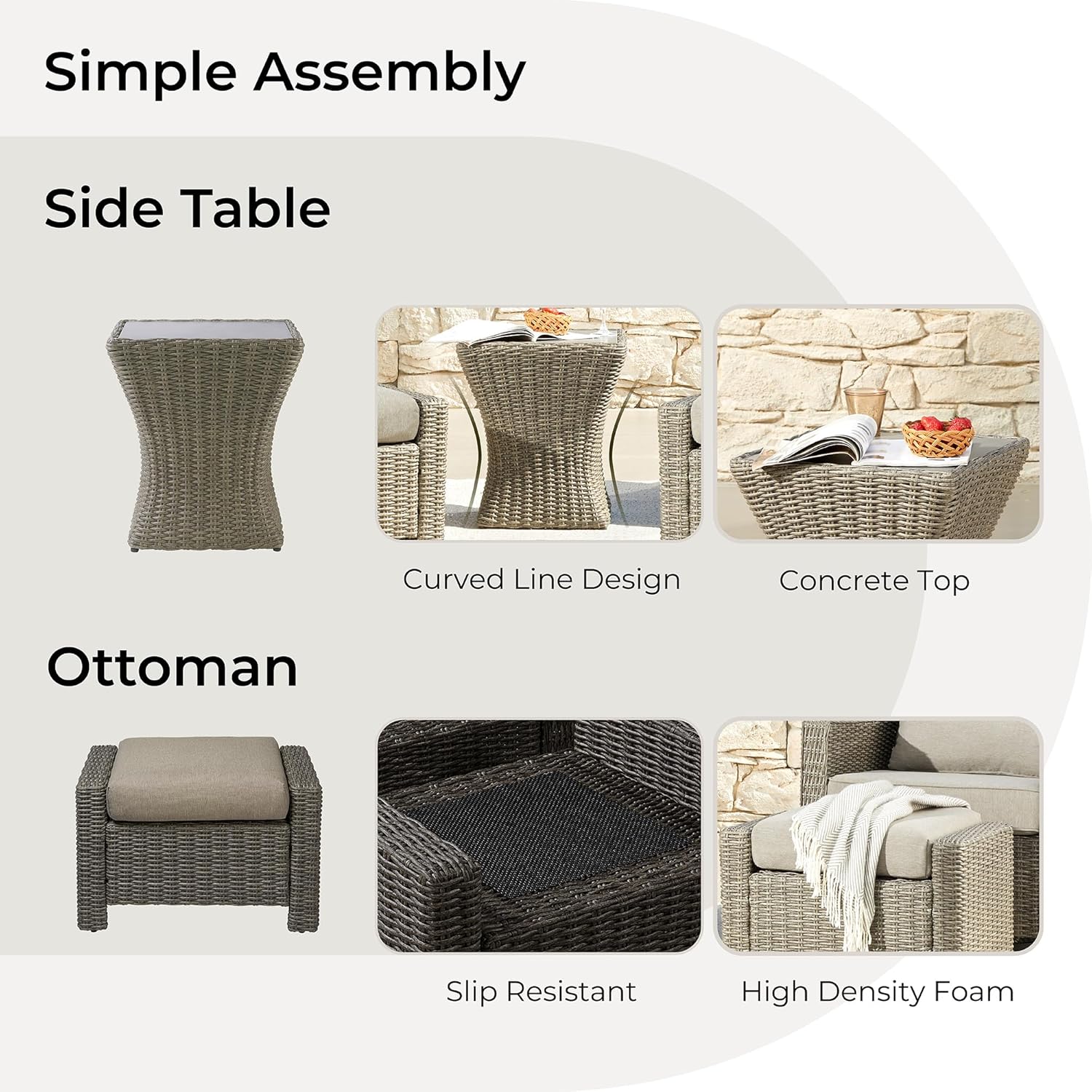 Five-Piece Set with a Modern Farmhouse Vibe: Crafted with meticulous attention to detail, this patio conversation set combines rustic charm and contemporary design. It boasts all-weather resin wicker intricately handwoven around a sturdy e-coated steel frame, ensuring both durability and elegance.